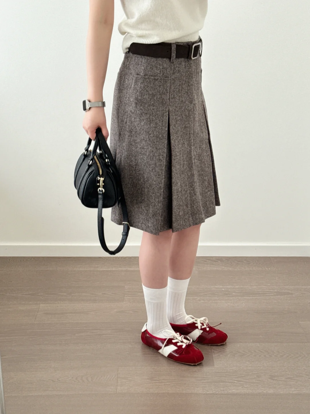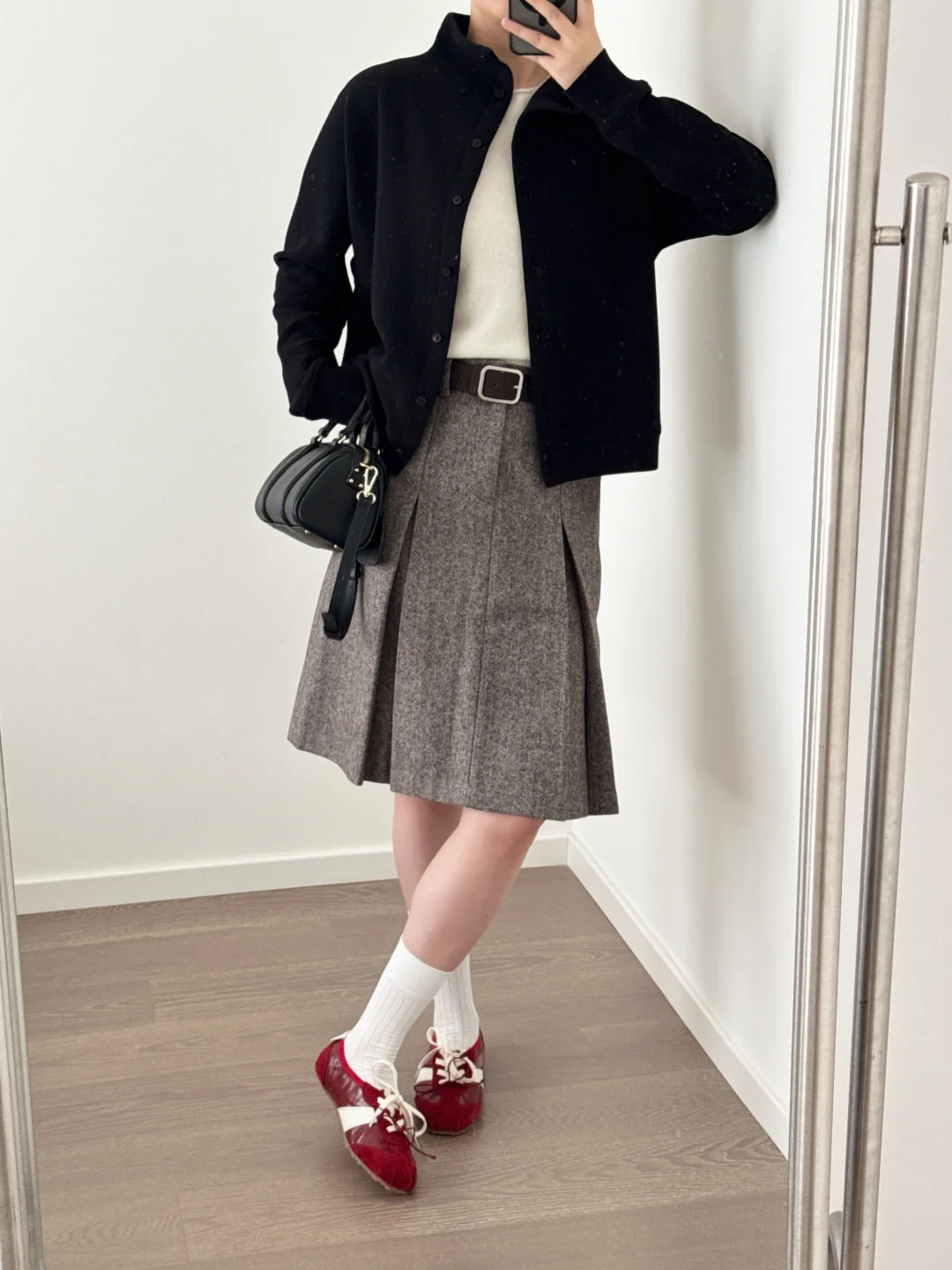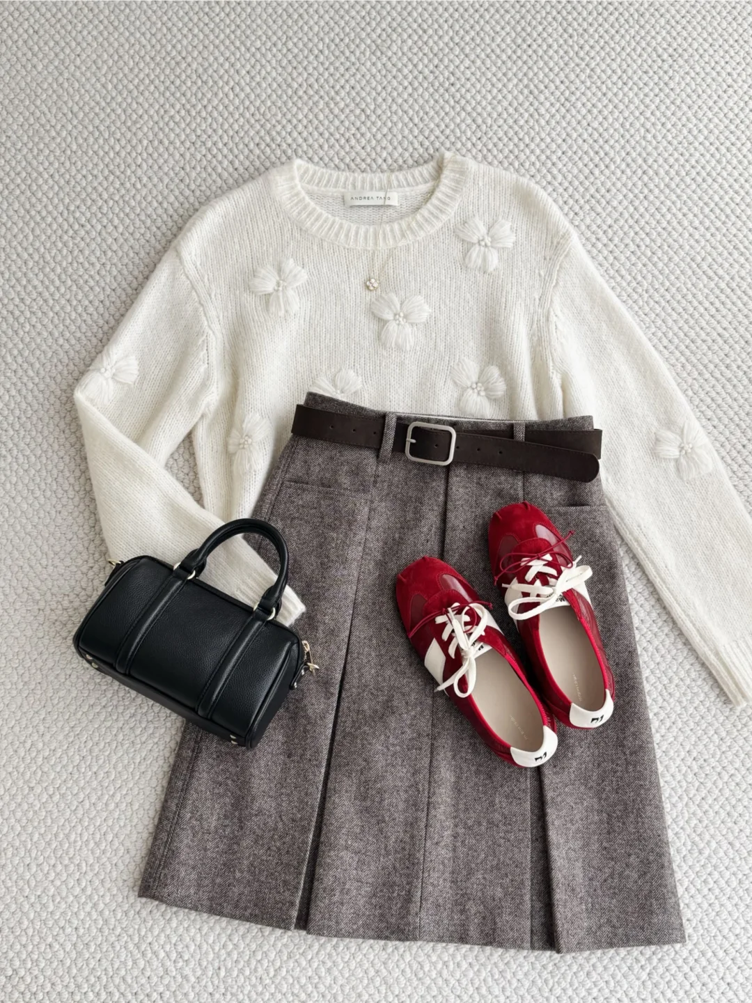 花朵刺绣毛衫+人字纹半裙+芭蕾德训鞋,法式复古