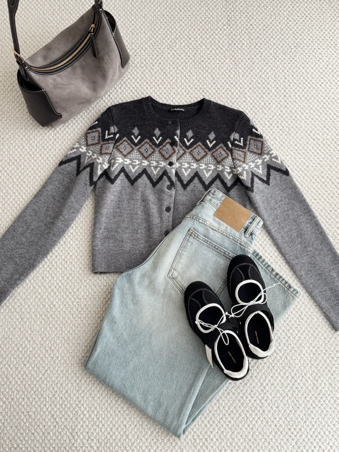 费尔岛开衫+蓝色牛仔+运动玛丽珍,休闲减龄