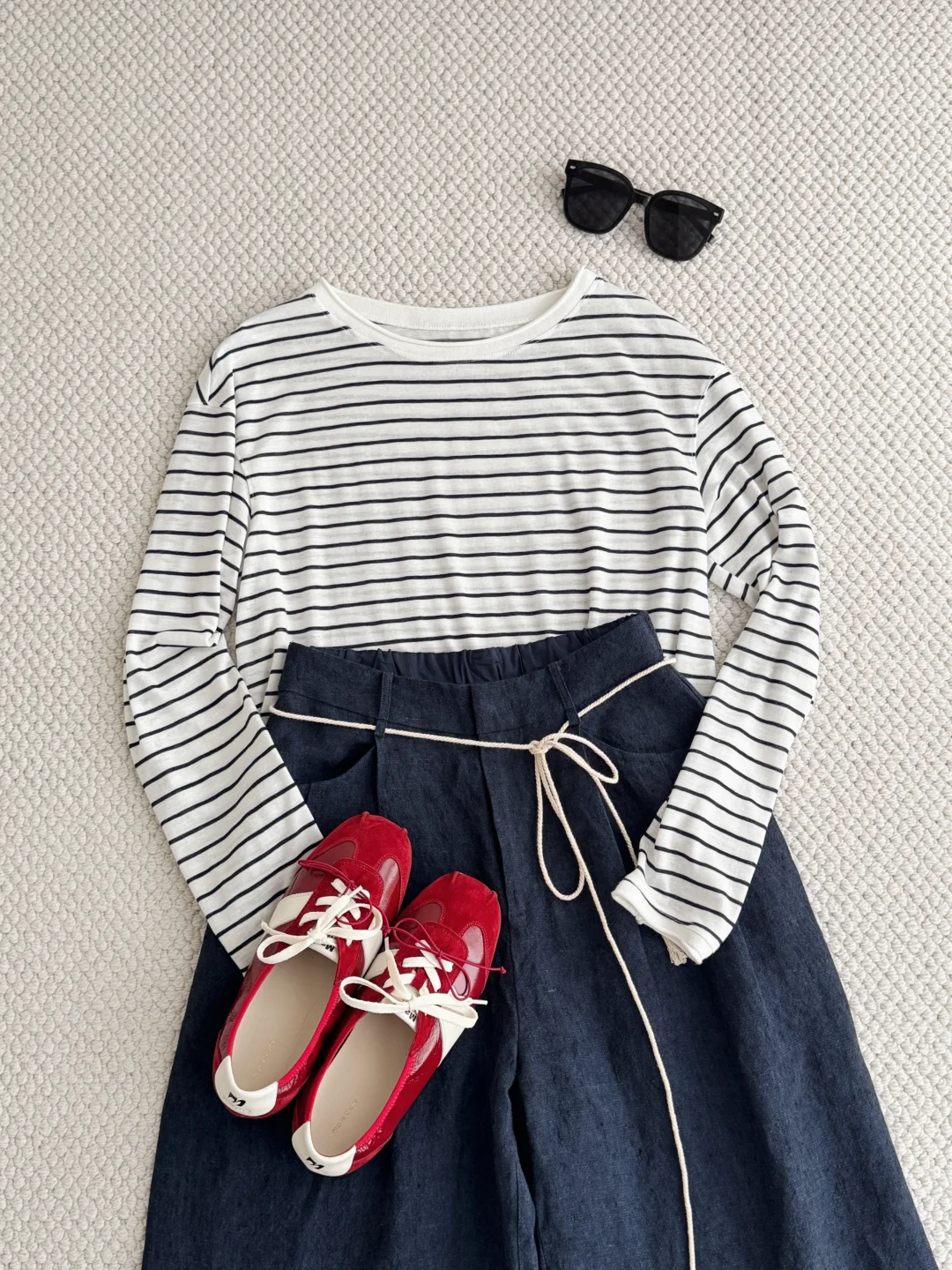 条纹长袖+藏青亚麻裤+芭蕾德训鞋,松弛日常