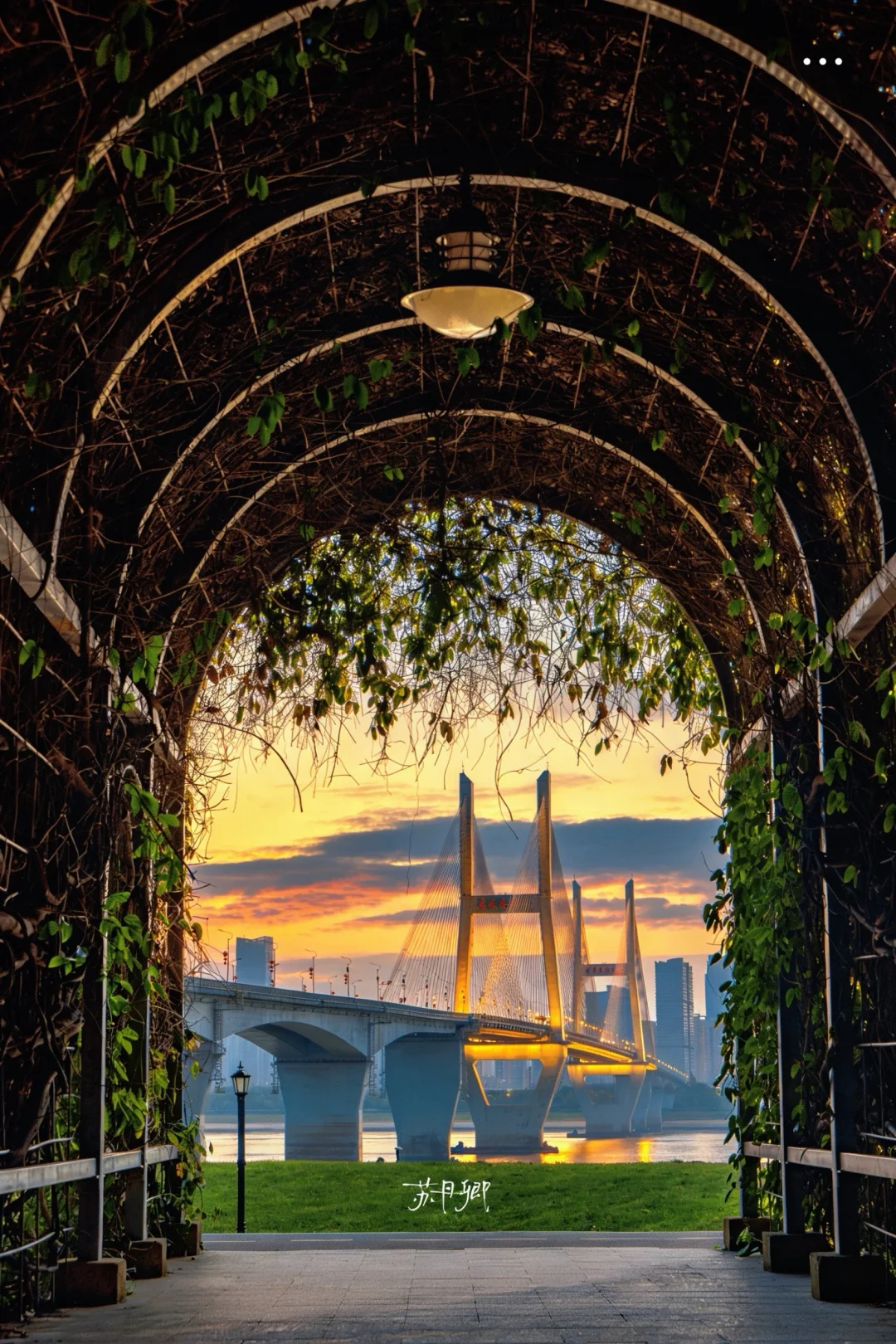汉口江滩黄埔门进入,通过绿藤拱形长廊拍摄武汉长江二桥颇有意思,日出很美,蓝调时刻也很美。