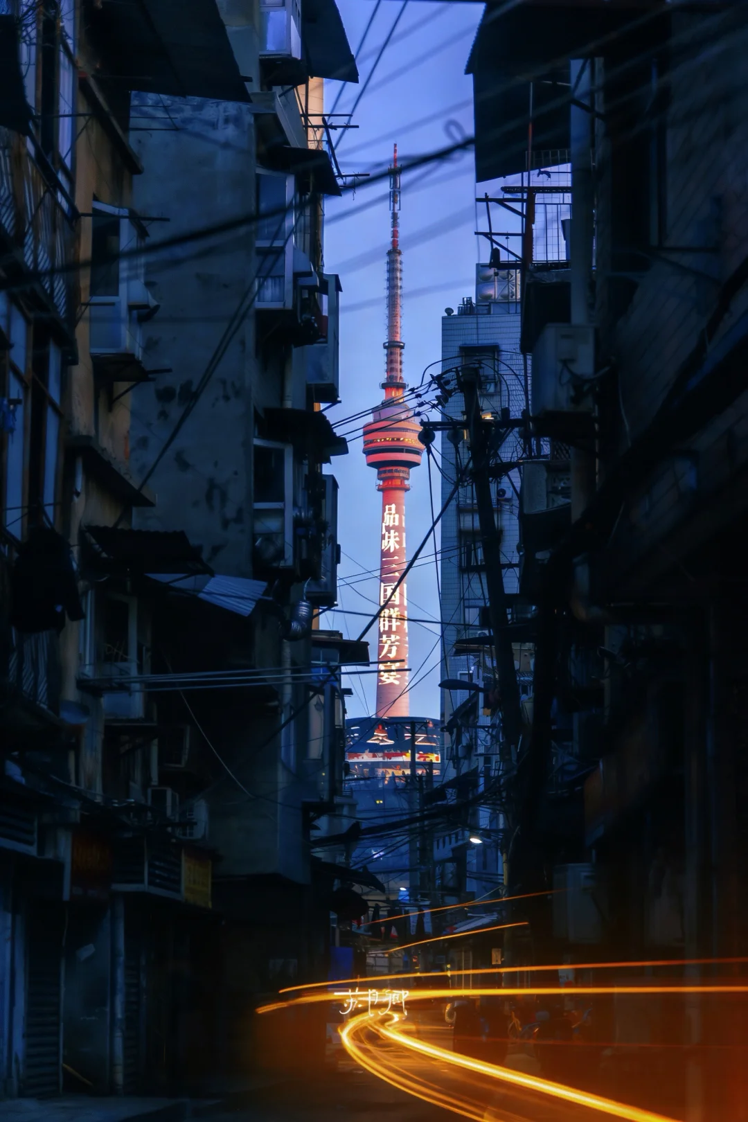 街巷中间的建筑物就是龟山电视塔,最佳拍摄时段:华灯初上的蓝调时刻。