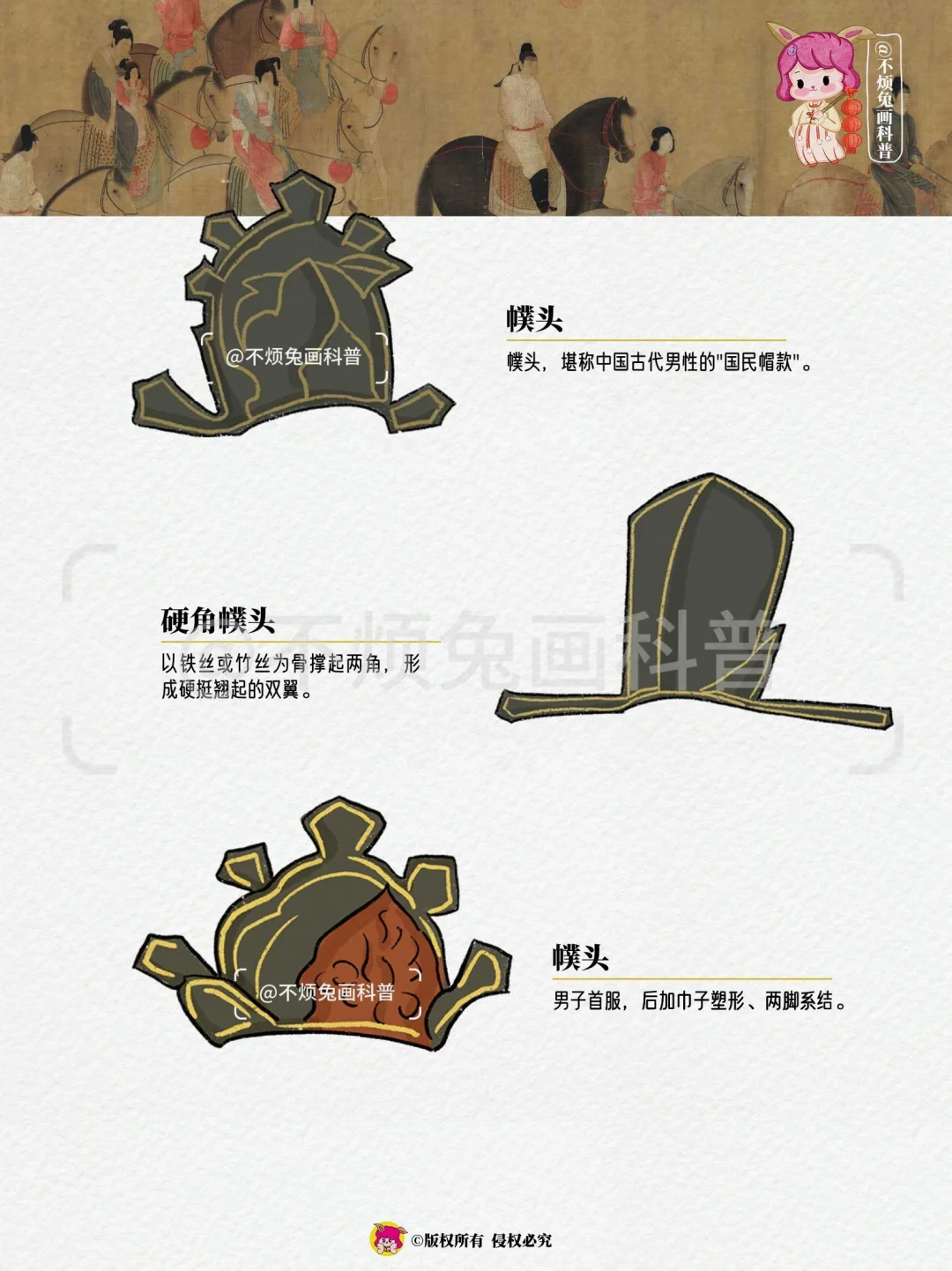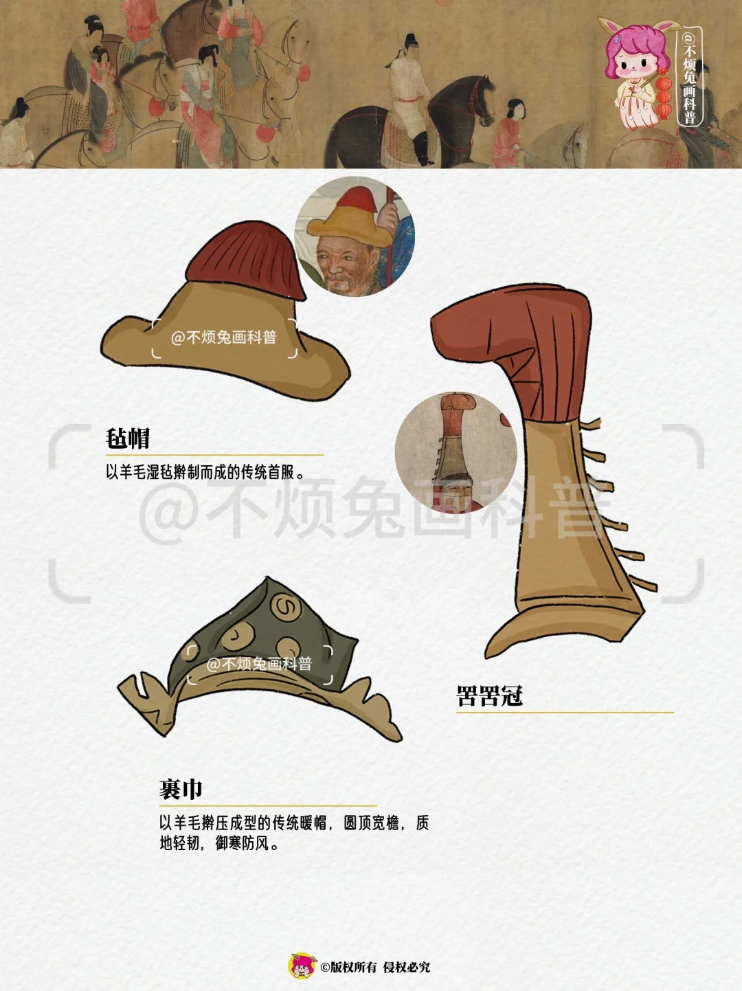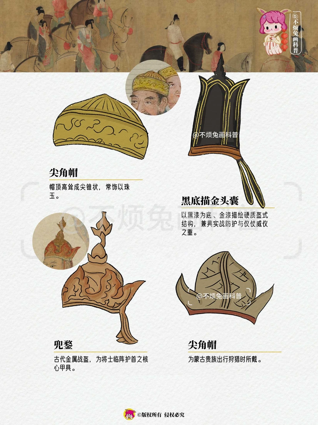 🔴古人戴帽,讲究的是一个"身份说明书",看看古画里的这些帽子好有趣! - 🔻幞头 🔻硬角幞头 🔻尖角帽 🔻黑底描金头囊 🔻兜鍪 🔻朝天幞头 🔻红底描金头囊 🔻罟罟冠 🔻毡帽 🔻裹巾 🔻罟罟冠 -