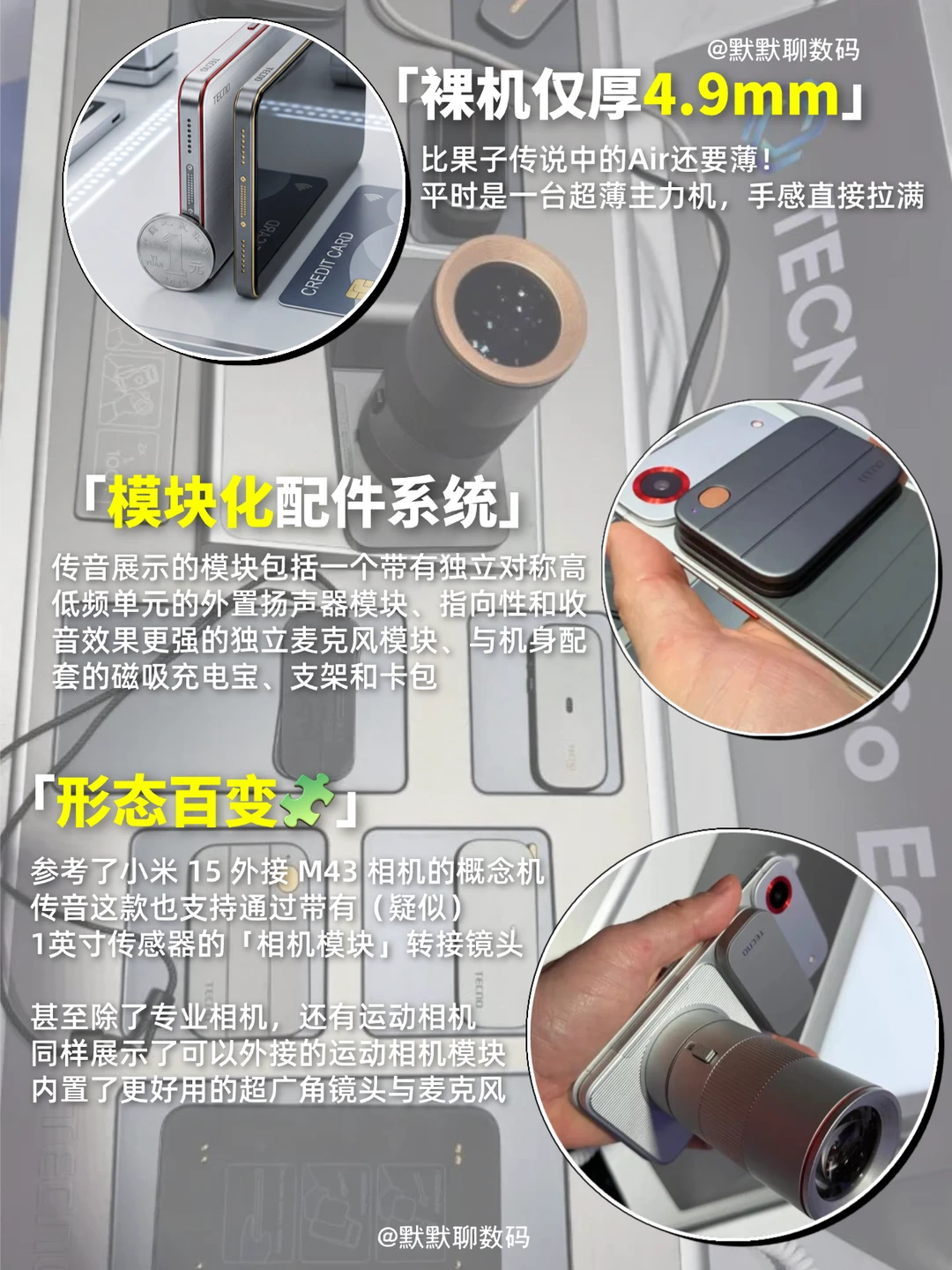 这台手机的精髓在于它丰富的拓展模块。只要在背后“啪嗒”一下,你能给它吸上带有(疑似)一英寸大底的专业相机模块,或者是超广角运动相机📸;想要看剧听歌?吸上独立高低频扬声器🎵;此外还有麦克风、充电宝和卡包。平时是极致轻薄机,需要时一秒变身专业设备,这思路绝了!