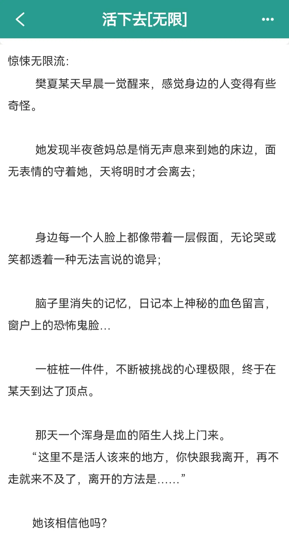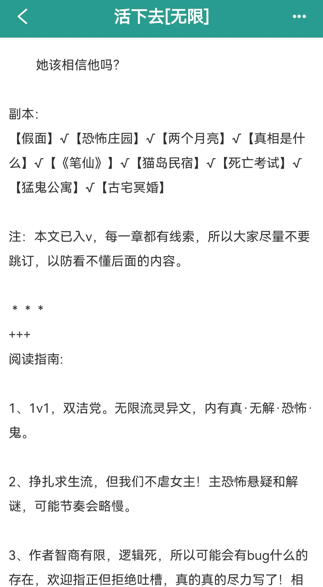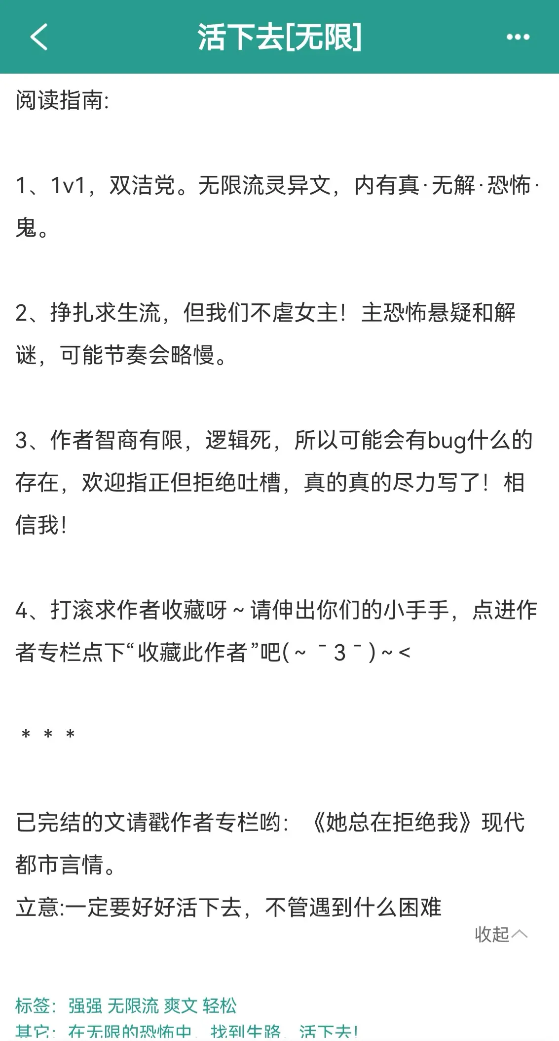 活下去(无限)作者PS 阅读指南: 1、1v1,双洁党。无限流灵异文,内有真·无解.恐怖. 鬼。 2、挣扎求生流,但我们不虐女主!主恐怖悬疑和解 谜,可能节奏会略慢。 3、作者智商有限,逻辑死,所以可能会有bug什么的 存在,欢迎指正但拒绝吐槽,真的真的尽力写了!相信我! 4、打滚求作者收藏呀~请伸出你们的小手手,点进作者专栏点下"收藏此作者"吧(~_З-)~< 无限强强爽文