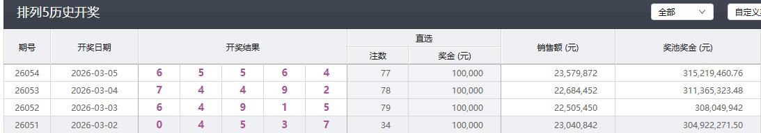 今晚开奖的排列五继续爆冷,仅开出一等奖77注,这已经是该玩法连续4天爆冷了,最冷的一天只开出34注一等奖,其他三天分别是77、78、79,这说明,最近开出的中奖号码整体上偏冷门了一些。 本期开奖号码是65564,大小号4:1,两组二同号码,上一期排列三刚开出744,这一期出655,属实出乎预料,爆冷也在常理之中。从排列三直选号码连续三期走低,也能管窥一斑。 本期排列五销量2357万,比前两期小幅增加,奖池里的奖金也累积到了3.15亿,连续五天微增,完全满足任何形式的倍投和爆奖。