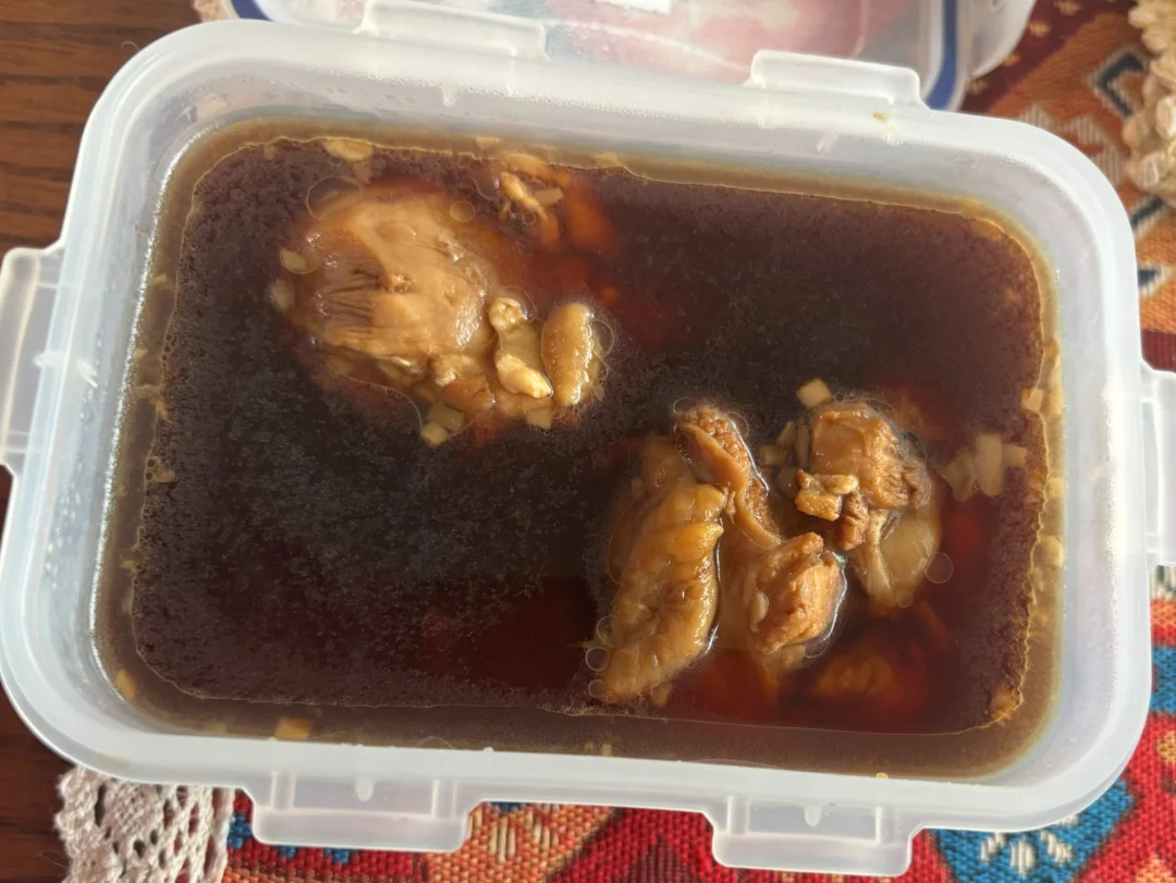 5. 鸡腿和卤汁一起放入冰箱冷藏一宿,吃的时候加热一下