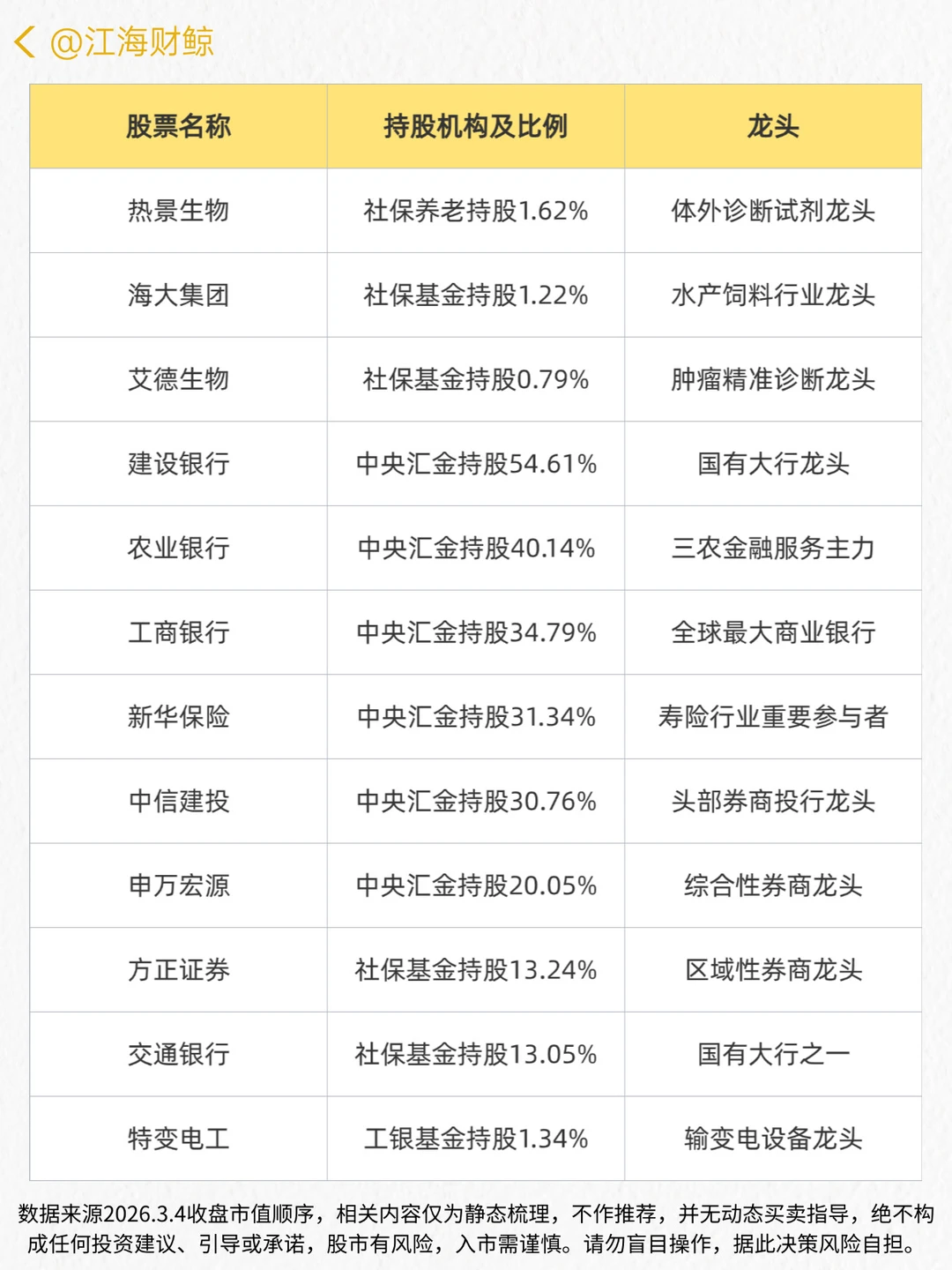 🔥A股“国家队”持有的龙头名单