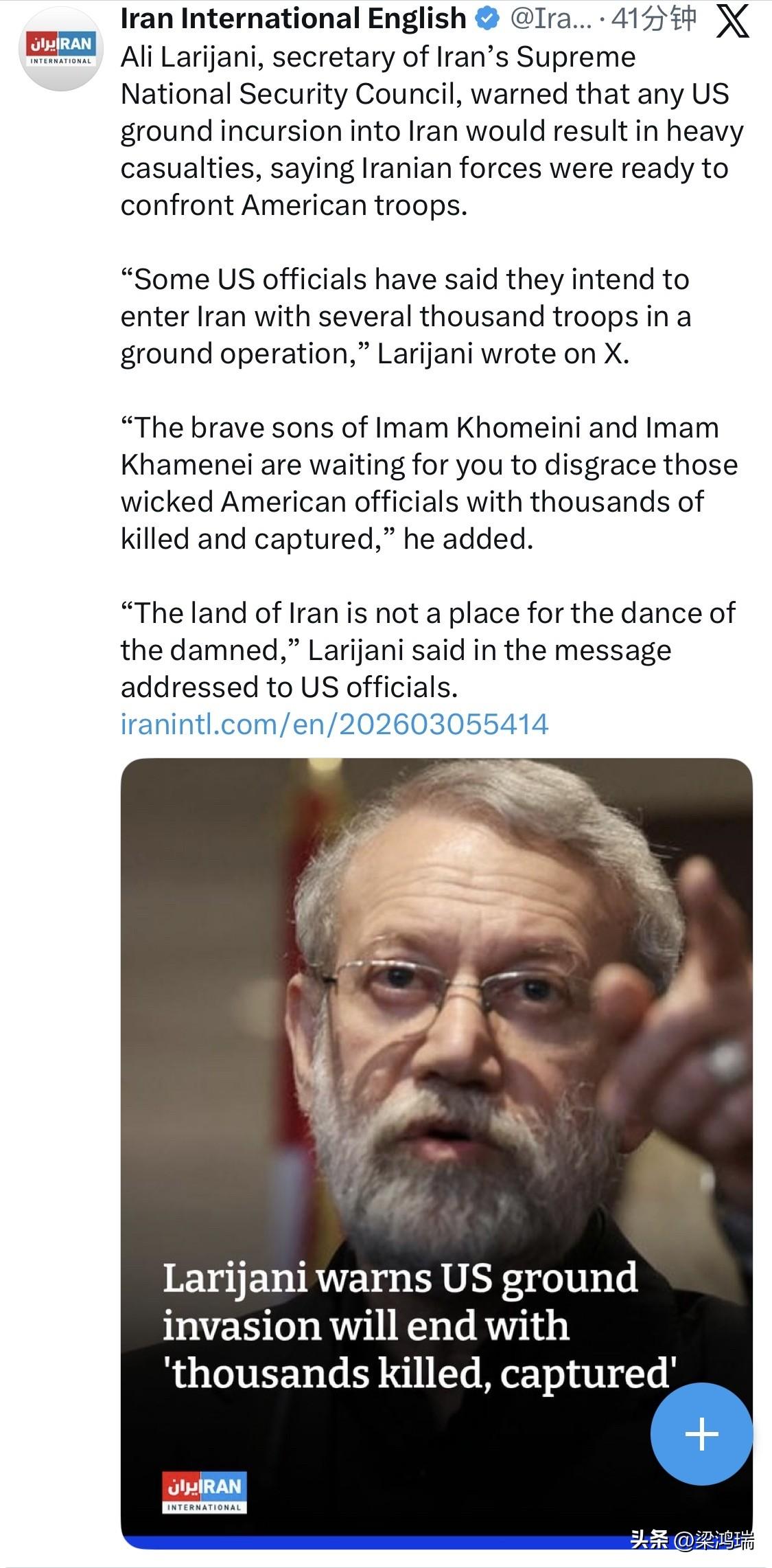 伊朗最高国家安全委员会秘书阿里·拉里贾尼警告说,任何美国地面入侵伊朗的行动都将导致重大伤亡,并表示伊朗军队已准备好与美军对抗。 拉里贾尼在X上写道:“一些美国官员表示,他们打算派遣数千名士兵以地面行动进入伊朗。” “霍梅尼和哈梅内伊的勇敢儿子们正等着你们用成千上万的杀戮和俘虏来羞辱那些邪恶的美国官员,”他补充道。 “伊朗这片土地不是亡灵之舞的场所,”拉里贾尼在致美国官员的信息中说道。