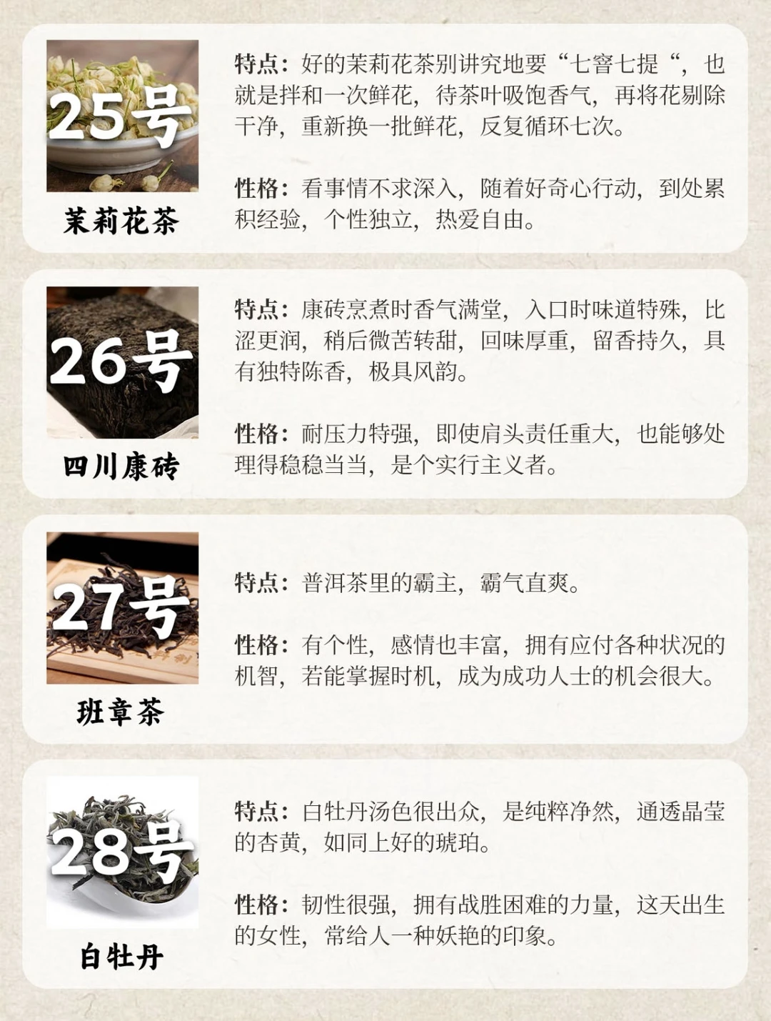 25号:茉莉花茶,茉莉花香浓郁,滋味鲜爽,清甜又治愈。