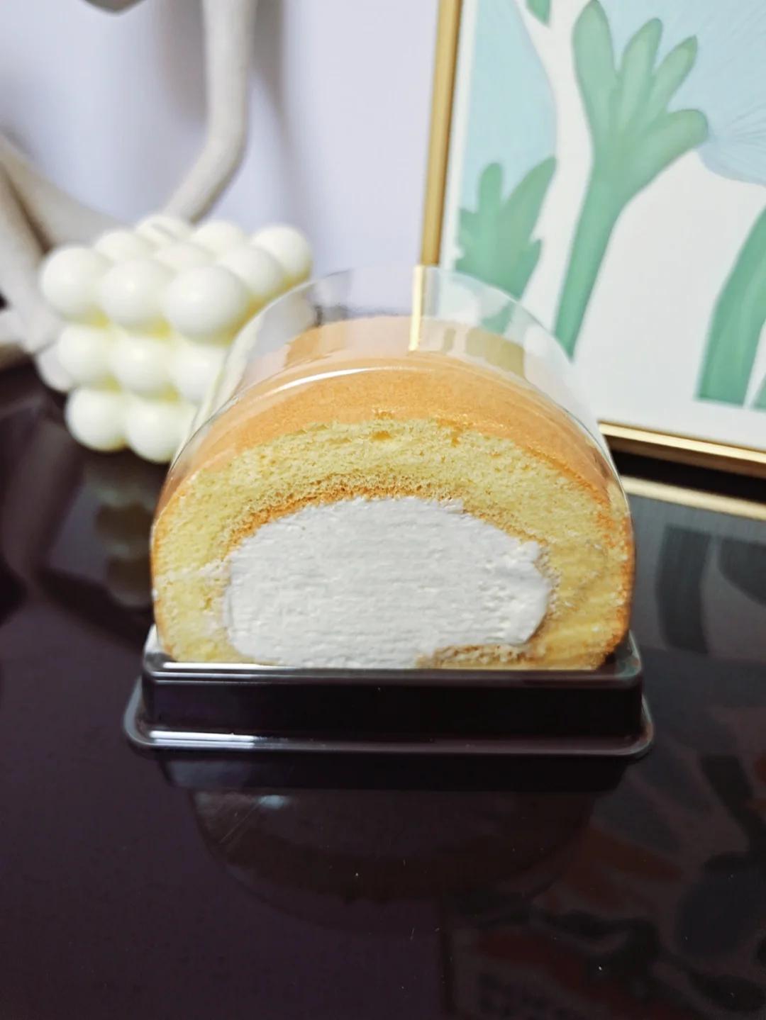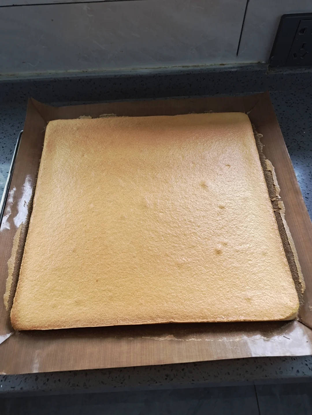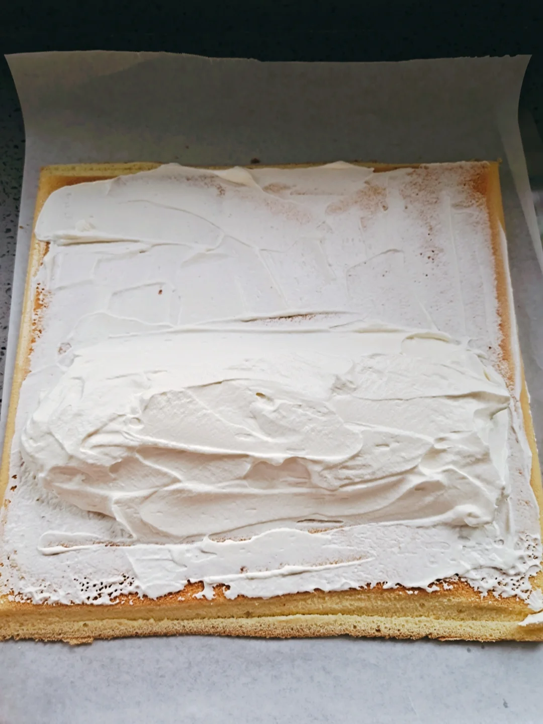 🌟烤好的蛋糕不要倒扣,把四角掀开晾凉后铺油纸倒过来撕下来油布,不太热就可以打发奶油,200克15克代糖,借用擀面杖卷起,大胆一点,表皮不会裂。卷起后冰箱冷藏一会定型。