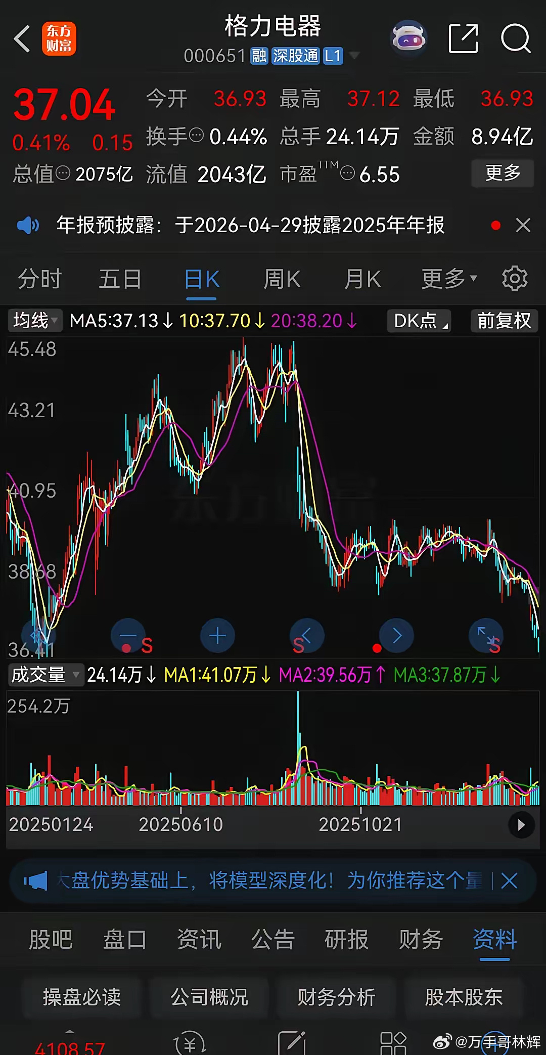 格力电器最近股价持续下跌,今天收盘股价报收于37.04元,昨天盘中股价最低36.60元,这个价格已经跌回了一年前,和去年2月份的低点正好构成了双底。