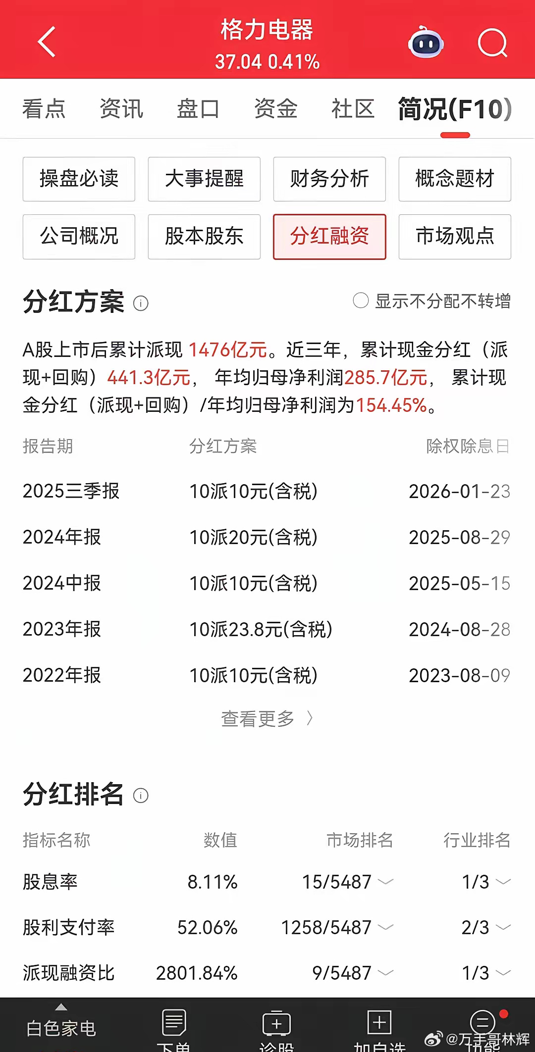 目前公司总市值2075亿元,每年净利润300亿左右,市盈率6.55倍,股息率达到了8.11%,行业排名第一。