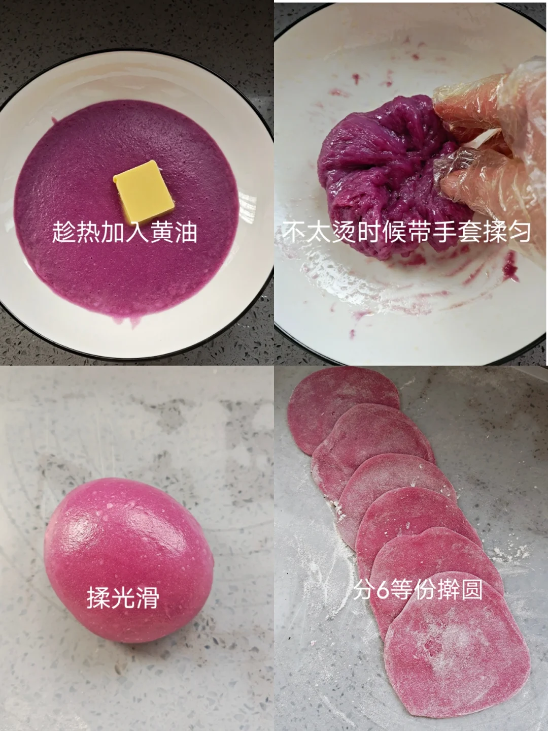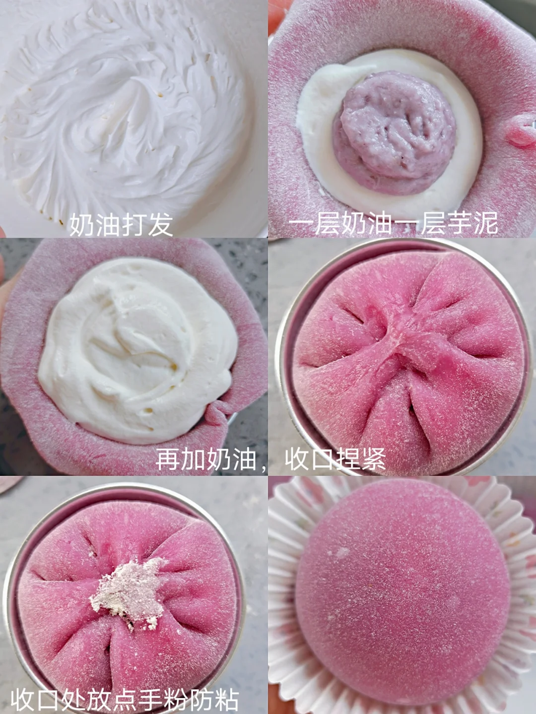 [三R]蒸熟的面团趁热放入黄油,不太烫的时候带手套揉匀,揉成光滑面团。分6等份擀圆,如图包入奶油和芋泥,收口捏紧。