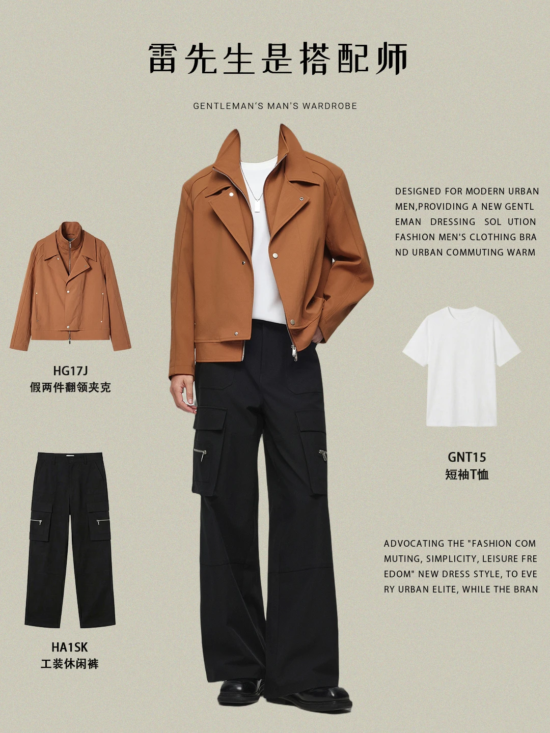 ✅ 方案一:暖感焦糖焦糖色夹克 + 纯白T恤 + 黑色工装裤 适用场景: 户外探店、日常约会。给人一种干净、有品位的温暖大哥哥感觉,亲和力十足。