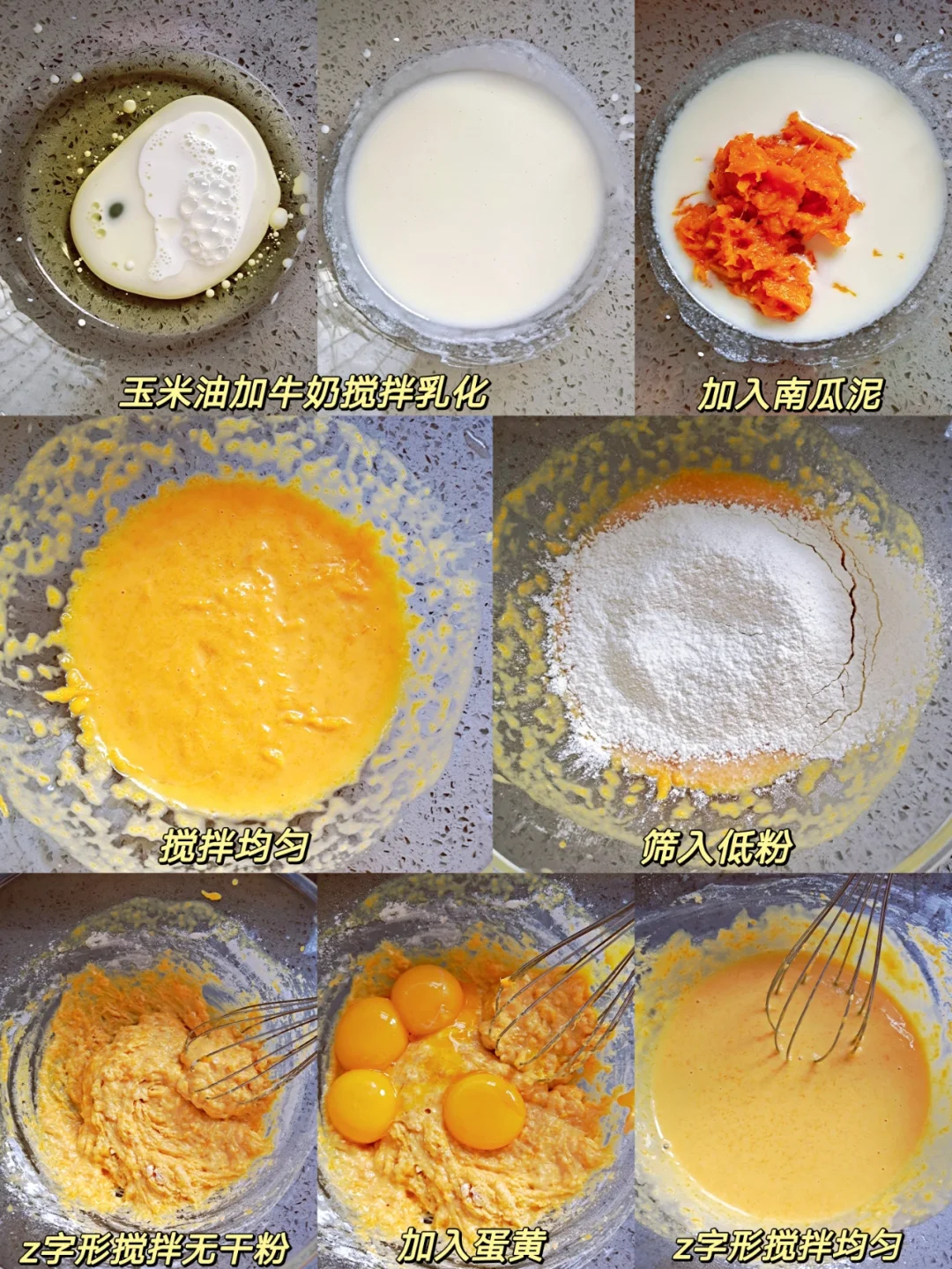 南瓜我没有刻意的打成泥,只是蒸熟后用勺子压散,成品里面能看到南瓜的果肉哦~