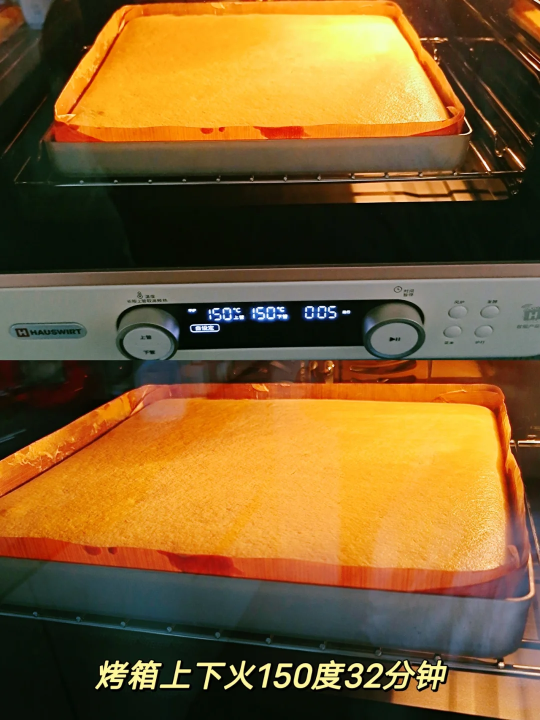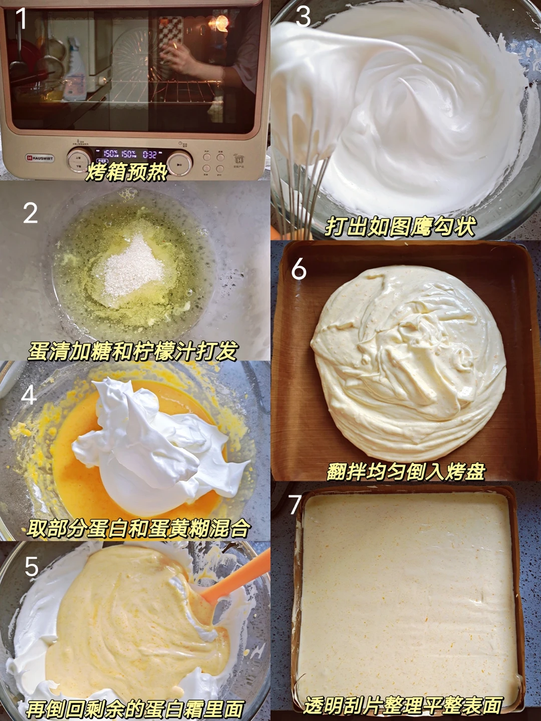 [五R]取三分之一蛋白霜和蛋黄糊混合翻拌均匀,再倒回剩余的蛋白霜里面,快速轻柔翻拌均匀,从高处倒入28*28的烤盘,轻震几下,用透明刮片整理表面平整,送入烤箱,上下火150度32分钟,因为是反卷我没有开热风,如果正卷,最后几分钟开热风或者将上火温度调高。