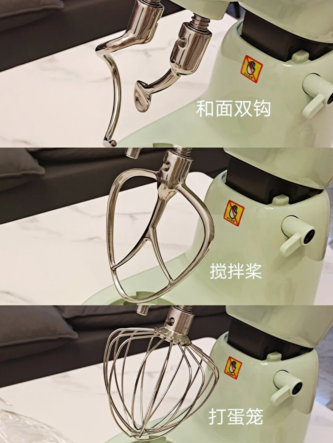 [二R]厨师机配件有:揉面桶、S型揉面钩、辅助揉面钩、搅拌桨、打蛋笼、防尘盖、说明书、可拆式电源线,猪鼻子的地方还可以换拓展配件(绞肉、灌肠、压面为选配配件,大家可按需购买)。