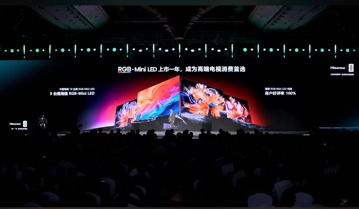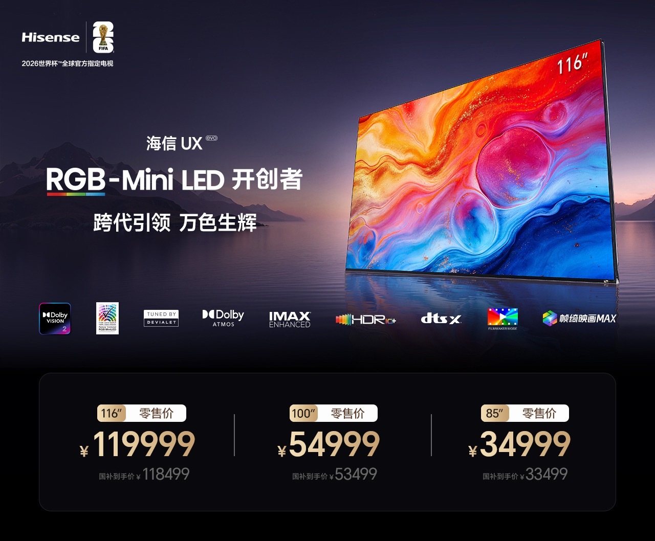 【海信UX 2026款RGB-Mini LED电视发布】画质新巅峰,首创玲珑4芯真彩背光,新增天青色芯片,实现110% BT.2020超高色域,多呈现1.2亿种色彩。