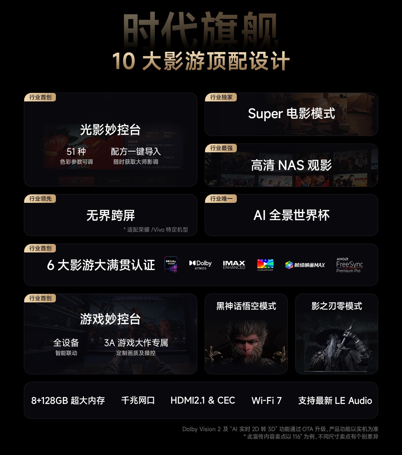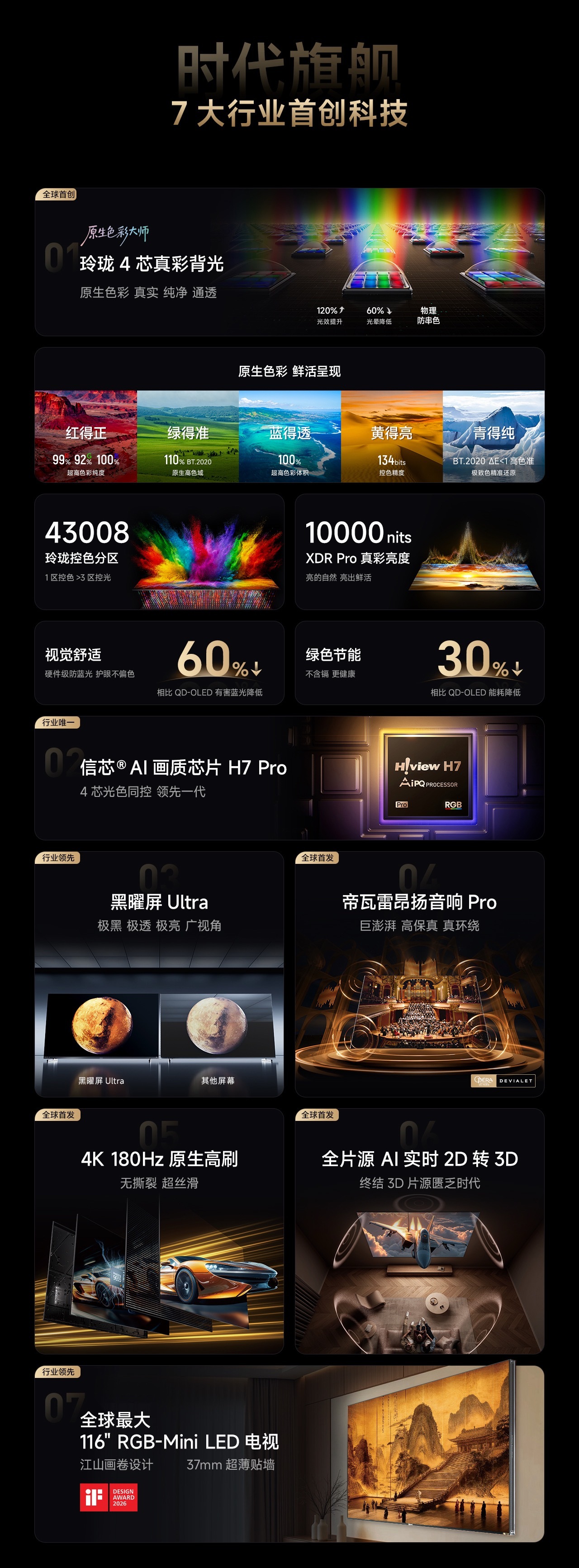 搭载自研信芯H7 Pro芯片,43008个控色分区+10000尼特峰值亮度,搭配黑曜屏Ultra与4K 180Hz原生高刷,画质直逼专业监视器。联合帝瓦雷打造6.2.2声道音响,支持AI全景世界杯与实时2D转3D,37mm超薄机身,8+128GB存储+Wi-Fi 7,34999元起,最大116英寸。