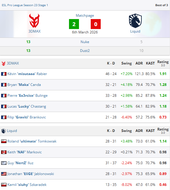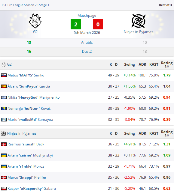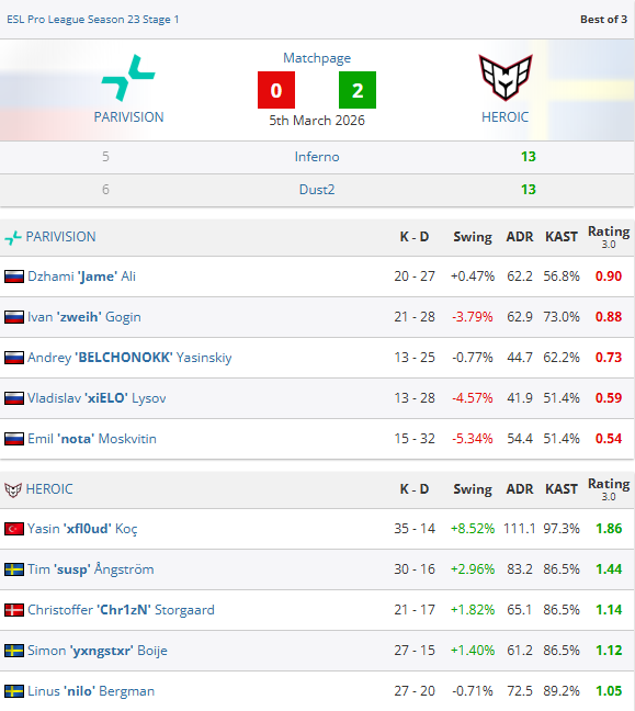 虎扑03月06日讯EPLS23第一阶段最后一个比赛日全部结束,PARIVISION爆冷0-2不敌HEROIC,在一度开局2胜0负的大好局面下,最终苦吞三连败被淘汰出局。