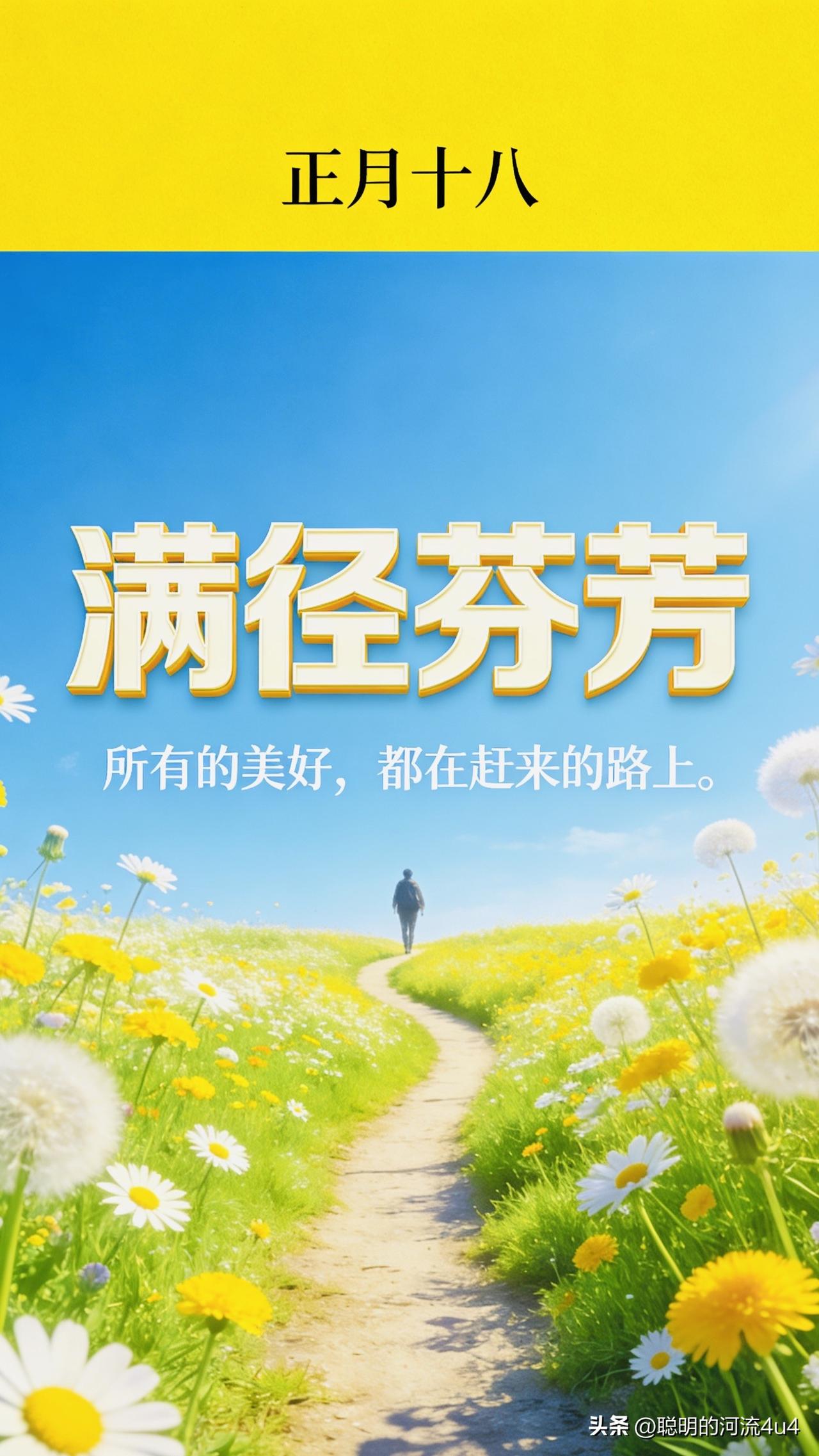 [微风]🌷🌞😍🌻💫🌷🍃 正月十八, 春风正暖, 阳光正好。 愿你往后的日子, 像翻开的书页, 每天都有新故事; 愿你的心情, 像刚发芽的柳枝, 柔软又有力量; 愿你的生活, 像春日里的花园, 处处有惊喜, 步步生芬芳。 把每个平凡的日子, 都过成自己喜欢的模样。 愿你心怀希望, 一路向阳, 收获满满的温暖与美好。 朋友们:早安! [微风]🍵🛤️🌻💖🎄🍃早晨打卡祝福语 晨语祝福美图 正月的祝福语