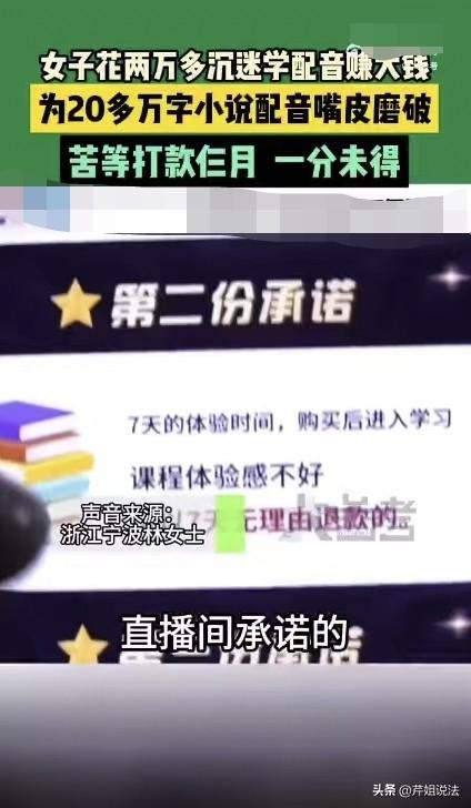 浙江宁波,林女士花2万多元钱报名学习配音,培训班承诺,毕业后就可接单赚钱,每个月能赚上6千。林女士毕业后接到培训班的任务,用一个月时间录完一部200多万字的小说,但3个月后一分钱也没赚到。林女士觉得自己让她们忽悠了,已进行了投诉。 据红星新闻报道,浙江宁波的林女士想学个技能开展自己的第二职业,增加一份额外收入。根据自身的兴趣爱好,她参加了一个网络配音培训班。 培训班的费用是2万多元,学期一个月左右,陈女士一开始也很犹豫,不知道自己学了以后能不能赚到钱。 招生的老师反复劝说林女士,说她的声音条件非常好,只要跟着课程学习,会进步的很快,培训结束后就可以给她配音任务,每个月都能有1000-6000的收入。 林女士一听有这么丰厚的回报,加上老师对自己的肯定,决定不再犹豫,当即付了学费。 林女士每天认认真真的跟着学习,一个多月后她毕业了。信心满满的找培训班为自己派单,对方也没做太多犹豫,给了她一本20多万字的小说,让她把小说录制下来。 接到任务的林女士很兴奋,她用了一个多月的时间把这部小说录了下来,但对方答应的报酬却始终没有兑现。 林女士多次询问,可对方就说让她等着,这一等过去3个月了,林女士始终没有拿到一分钱。 其实,科班出身的配音员都是经过长期培养出来的,哪能在一个月速成呢,感觉自己上当的林女士已经向相关部门进行了投诉。 这则报道里还提到一位河南商丘的安女士,她和林女士也有相似的经历,她在网上花16000多元报的配音课,报名前对方说,普通话不标准也可以接单赚钱,同样承诺,只要跟着学习就肯定能赚到钱。 结果交了学费以后,不但对方没有给安女士派发任务,还给安女士拉黑了,安女士的16000元等于打了水漂。 安女士的儿子对她说,你自己有很重的方言和咬字问题,普通话都没说好,怎么可能通过配音赚钱。 安女士的儿子对他们的学员做了调查,发现像安女士这样的受害者少说有十几位,她们遇到的套路几乎是一样的。 这样的事情在网络上传播以后,还有很多网友给出了自己的经历。 有一位网友说,自己是无意间在短视频上看到一位老师,每天都在滔滔不绝的说配音行业的前景广阔和可观的收入,边说边引导大家加入他的社团。 加入以后,她发现里边有好几百人,每天都会有人免费带着大家练习基本功,但有人介绍老师正在收徒,成为老师的徒弟后,就可以接受专业的培养。老师有各种有声书和配音的资源,跟着老师一定能赚到钱。 网友说自己花了4500元拜师费,被人拉到一个群里,发现老师的徒弟有将近二百人。 但她发现授课的并不是这位老师,而是老师先收的徒弟在给后来的徒弟上课,上课的内容也很随机,和之前免费的基本功差不多。 而且有人介绍,想要快速接到价格高的录制单还要继续交费。还向她推销录音设备。 经过几个月的了解,她才发现这位老师并不是配音领域的专业人士,水平非常有限,她感觉自己被骗了,就主动的退出了社群。 像这样名不符实的成人教学课并不少见,他们用的套路几乎都是让人们先进入一个免费的公开课,但这样的课程里几乎不教什么实用知识,都是在极力推销售己的收费课程,最终目的就让人报课交学费。 很多交了学费的学员并没有学到任何东西,也没有得到对方的各种承诺。向林女士这样选择投诉的人也不少。 根据《消费者权益保护法》第二十条的规定,经营者向消费者提供有关商品或者服务的质量、性能、用途、有效期限等信息应当真实、全面,不得做虚假或者引入误解的宣传。 《消费者权益保护法》第五十五条的规定,经营者提供商品或者服务有欺诈行为的,应当按照消费者的要求增加赔偿其受到的损失,增加赔偿的金额为消费者购买商品的价款或者接受服务的费用的三倍;增加赔偿的金额不足五百元的,为五百元。本法条指出的欺诈指经营者提供商品或服务时作虚假宣传,导致消费者错误购买。 培训班为了招揽学员,赚取学费而对培训内容进行虚假宣传,并对培训结果进行夸大,拉低学员的进入门槛,不顾教学质量的行为已构成消费欺诈,应承担相应的惩罚后果。 而像安女士遇到的情况就不仅仅涉嫌消费欺诈,对方的做法以涉嫌构成诈骗罪。 根据《刑法》第二百六十六条的规定,以非法占有为目的,采用虚构事实或隐瞒真相的方法,骗取数额较大公私财物的行为构成欺诈罪。 对方隐瞒配音行业需要具有标准普通话的事实,虚构出普通话不标准也能接单的虚假事实,收到学费后,并没有提供真实的课程,其目的就是骗取安女士16000多元的学费,涉及金额较大,已构成诈骗罪。 而那位网友交拜师费后发现自己被骗的情况,却很难根据以上法律条款进行定性。拜师并不是商业行为,不适用于《消费者权益保护法》,在师徒群里一直都人有教学,也无法证明他这是虚构事实,没有教学意图的行为,取证变得困难,很难对他进行处罚。 对于成年人该如何选择网络培训班的事情,您有哪些观点,欢迎留言交流。