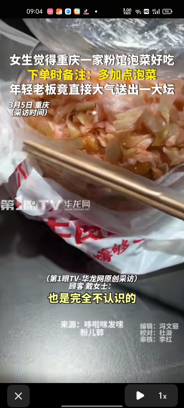 3月3日,重庆。女生觉得一家粉馆的泡菜好吃,下单时备注“多给我加点泡菜”,没想到老板直接送一坛。 老板郭先生表示,有时候有些顾客都比较好玩,留一些奇奇怪怪的备注,有时候能满足的都满足一下,反正都是年轻人。