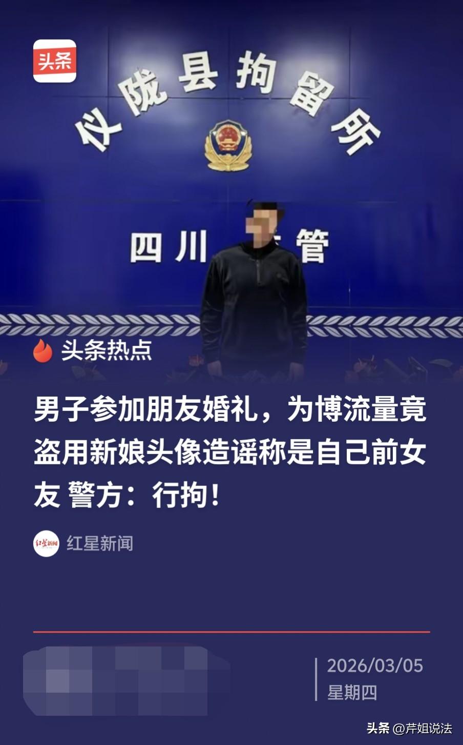 玩归玩,闹归闹,别拿造谣开玩笑!四川南充,一男子参加朋友婚礼,却借机“炒作”,博取流量,在网上声称新娘是自己的前女友!这下男子真“火”了,这个总想搞个大新闻出来的“戏精”,成功把自己给“作”进去了。 据悉,男子李某是张某的朋友,马上要结婚的张某邀请李某去参加自己的婚礼,这原本是皆大欢喜的事,好朋友结婚了,自己去送个祝福 ,还沾沾喜气儿。 可这李某的脑袋瓜儿就是“出奇”,他想的不是去送祝福,而是想借这个婚礼让自己在网络上火一把! 你没听错,他想红,但他走的路子,不是唱歌跳舞讲段子,而是一条通往警察局的“捷径”,那就是造谣! 于是,李某就开始立深情人设,在某平台上声称新娘是自己的前女友。 但光有文字还不行,得有图有真相啊!为了让大家相信,李某盗取了新娘的真人头像,还将其邀请自己参加婚礼的聊天记录,以及婚礼现场的照片、婚礼地址等一块发在了网络上。 这下可不得了,这内容真就爆了,浏览量冲破10万。他是爽了,流量也到手了,可他完全没想过张某夫妇会经历什么。网上对张某夫妇的议论不少,已经对他们的声誉造成影响了! 纸终究是包不住火的,这种靠造谣、博眼球换取流量也是维持不住的,警方接到举报后,立马将李某给行政拘留了。 李某的行为已经触犯了《治安管理处罚法》第25条,有下列行为之一的,处五日以上十日以下拘留,可以并处五百元以下罚款。情节较轻的,处五日以下拘留或者五百元以下罚款。 (一)散布谣言,谎报险情、疫情、警情或者以其他方法故意扰乱公共秩序的。 (二)投放虚假的爆炸性、毒害性、放射性、腐蚀性物质或者传染病病原体等危险物质扰乱公共秩序的。 (三)扬言实施放火、爆炸、投放危险物质扰乱公共秩序的。 李某这事儿到底严不严重?答案是非常严重! 首先,他造谣的对象是特定的,直接损害了张某夫妇的名誉,让人家在亲朋好友面前抬不起头。其次,他的帖子浏览量超过10万,传播范围极广,造成了很坏的社会影响。 还有一点,他是借着朋友的婚礼搞事情,在人家人生中这么重要的场合里造谣生事,这性质就更恶劣了。 此事一出,网友也是议论纷纷。 有网友表示,干得漂亮!这种为了流量去造谣别人的人,就该让警察好好教育一下! 也有网友说,真是交友不慎啊,怎么摊上这么个“好兄弟”? 还有网友表示,网络不是法外之地,想当网红可以,得凭真本事,靠造谣博眼球,迟早翻车! 李某这事也给我们每个人,尤其是想当网红的人,敲了一个警钟。流量这东西确实诱人,但不是什么流量都能追,想走红的方式有很多,可以展示才艺、搞怪逗乐,但绝对不能瞎编话害人。 靠歪门邪道换来的热度,就像沙滩上堆的房子,一个浪打过来就都塌了,这搞不好还会把自己拍死在沙滩上! 此外,像李某这类把利益看得比情义还重的人,需要格外注意了。平时称兄道弟挺热乎,关键时刻可能就会为了某些利益背后捅人刀子。这样的朋友,发现一个,远离一个,千万别深交! 幸好警方处理得迅速又果断,及时制止了谣言的扩散,保护了受害者的权益。靠造谣换来的热闹,终究是过眼云烟,那些靠真心换来的情分,才能暖人一辈子! 对于上述事件,您有什么看法吗?欢迎留言交流。 来源:红星新闻 浪涨新闻