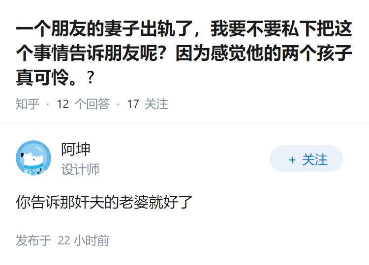 一个朋友的妻子出轨了,我要不要私下把这个事情告诉朋友呢?因为感觉他的两个孩子真可
