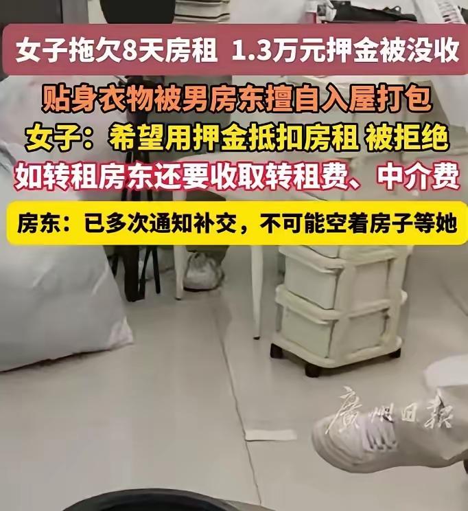 租客拖欠房租被男房东打包私物扔门口,内衣裤被翻动,网友吵翻了! 广州23岁女租客陈虹拖欠8天房租,被男房东带着人上门,直接把她的行李,包括内衣、内裤等私人物品,全部打包扔到了门口。 她崩溃表示,被两个大男人翻动贴身衣物,感觉“生理不适”,想让1.36万押金抵扣房租也被拒绝。 而房东则称,已多次通知她补交或搬离,她拒不配合,按合同中途退租,押金本就不予退还,不可能空着房子等她。 这件事在网上吵翻了:有人说租客违约在先,房东是合理维权;也有人说,就算租客有错,房东擅自进入房间、翻动女性私物,也太不尊重人,涉嫌侵犯隐私。 租客
