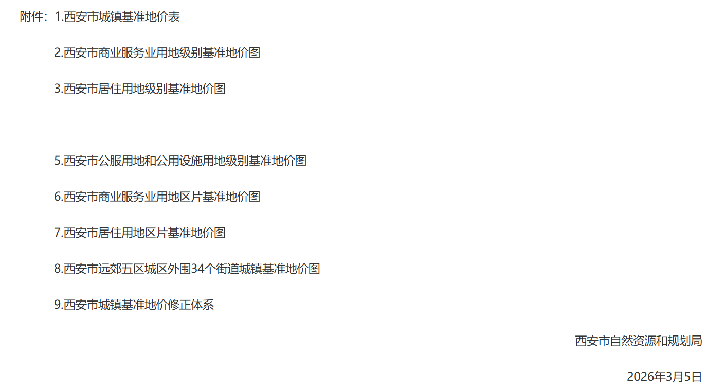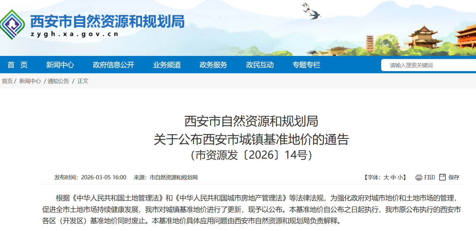 3月5日,西安市自然资源和规划局关于公布西安市城镇基准地价的通告(市资源发〔2026〕14号)政策发布。