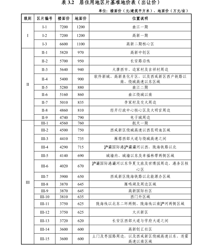 对比2020版基准地价,本轮居住用地价格体系呈现结构性跃升:上一轮Ⅰ类住宅用地(曲江、高新)基准楼面价为4650元/㎡,本轮划定同区域为最高级别,楼面价达7200元/㎡。
