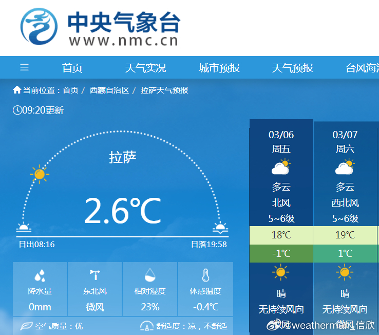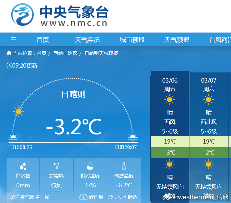 【西藏温暖奔纪录】今明2天,受到高空暖高压脊影响,西藏的气温会大幅偏高,可能接近或打破当地同期最高纪录。比如日喀则预报3月6-7日最高19℃,当地3月上旬最高纪录为18.8℃。拉萨预报3月7日最高19℃,当地3月上旬纪录为20.2℃。不过高原地区昼夜温差大,夜间气温依然较低,需要注意保暖。