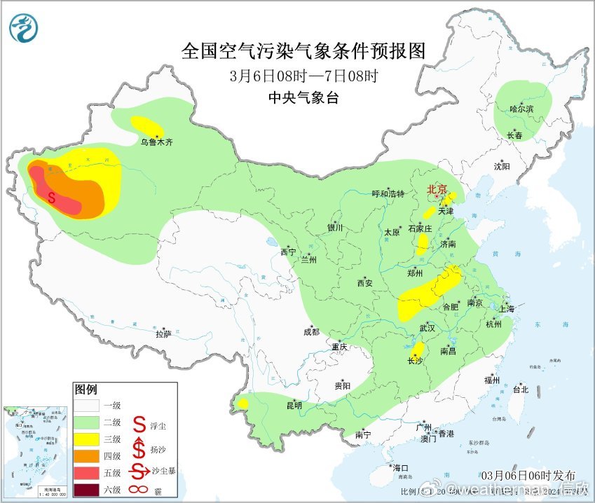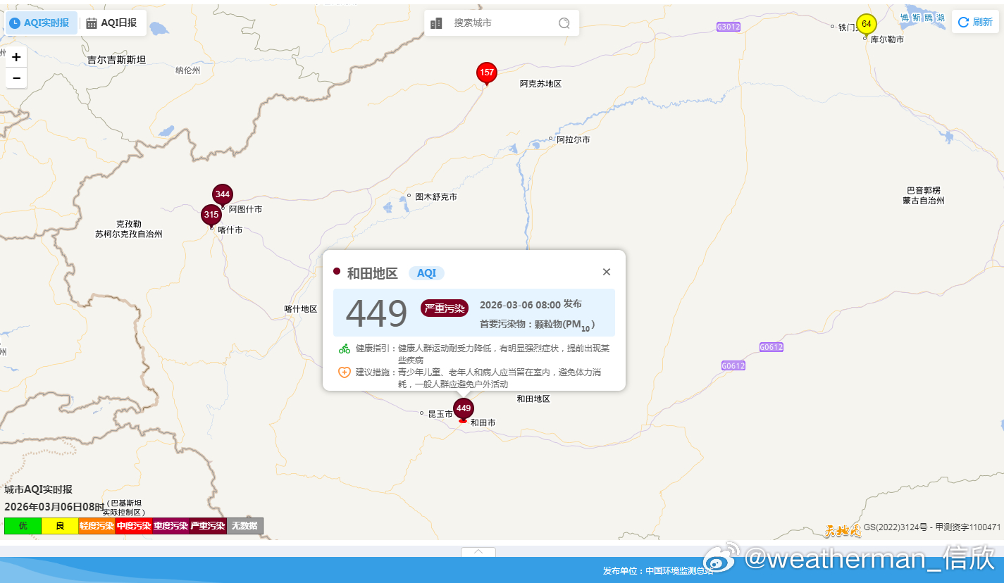 从今晨空气质量看,山东河南湖北还有一些站点存在轻度污染,有霾。新疆塔里木盆地还有沙尘导致的污染,不会强度减弱,喀什、克州、和田已经结束爆表。今后3天,塔里木盆地的沙尘可能还会持续。中东部地区因为冷空气不断扩散南下,大气扩散条件总体有利,没有明显的霾,但在降水间歇期,清晨湿度大,还是要警惕有雾。