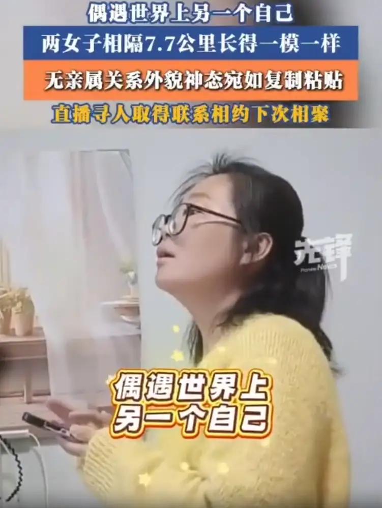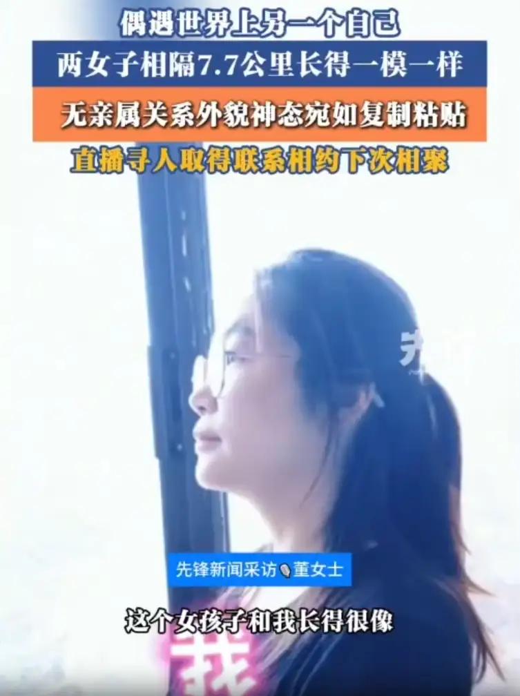 河南洛阳,女子和外甥女开车出门,突然发现车外一名女子和她长得几乎一模一样,要不是人就坐在车里,外甥女差点就认错人了,事后女子努力找到对方,得知双方家的距离相隔7公里,但两人却没有任何交集,更不要说血缘关系,这让她也觉得很神奇。 当时车辆行驶在街头,外甥女突然指着窗外大喊,董女士顺着方向望去,瞬间愣住。车外女子的脸型、眉眼、神态,都和自己高度相似,若不是自己正坐在车内,就连身边亲人都难以分清真假。这场突如其来的相遇,让两人又惊又奇,遗憾的是,当时未能留下对方联系方式。 好奇心驱使下,董女士决定寻找这位姐妹。她借助网络直播分享这段奇遇,希望网友帮忙寻人。没想到缘分妙不可言,短短三天,对方就主动联系上了董女士。 两人深入沟通后,更多巧合令人直呼神奇。她们的家仅相隔7公里,日常活动范围多有重叠,甚至常去同一个集市,却在数十年里从未相遇。双方仔细核对家族信息,确认没有任何血缘关系,祖上也无交集,完全是素不相识的陌生人。 不少网友感叹,这是比小说还离奇的缘分。在小小的7公里范围内,无血缘、无交集,却能遇见容貌高度重合的陌生人,堪称现实版平行时空。
