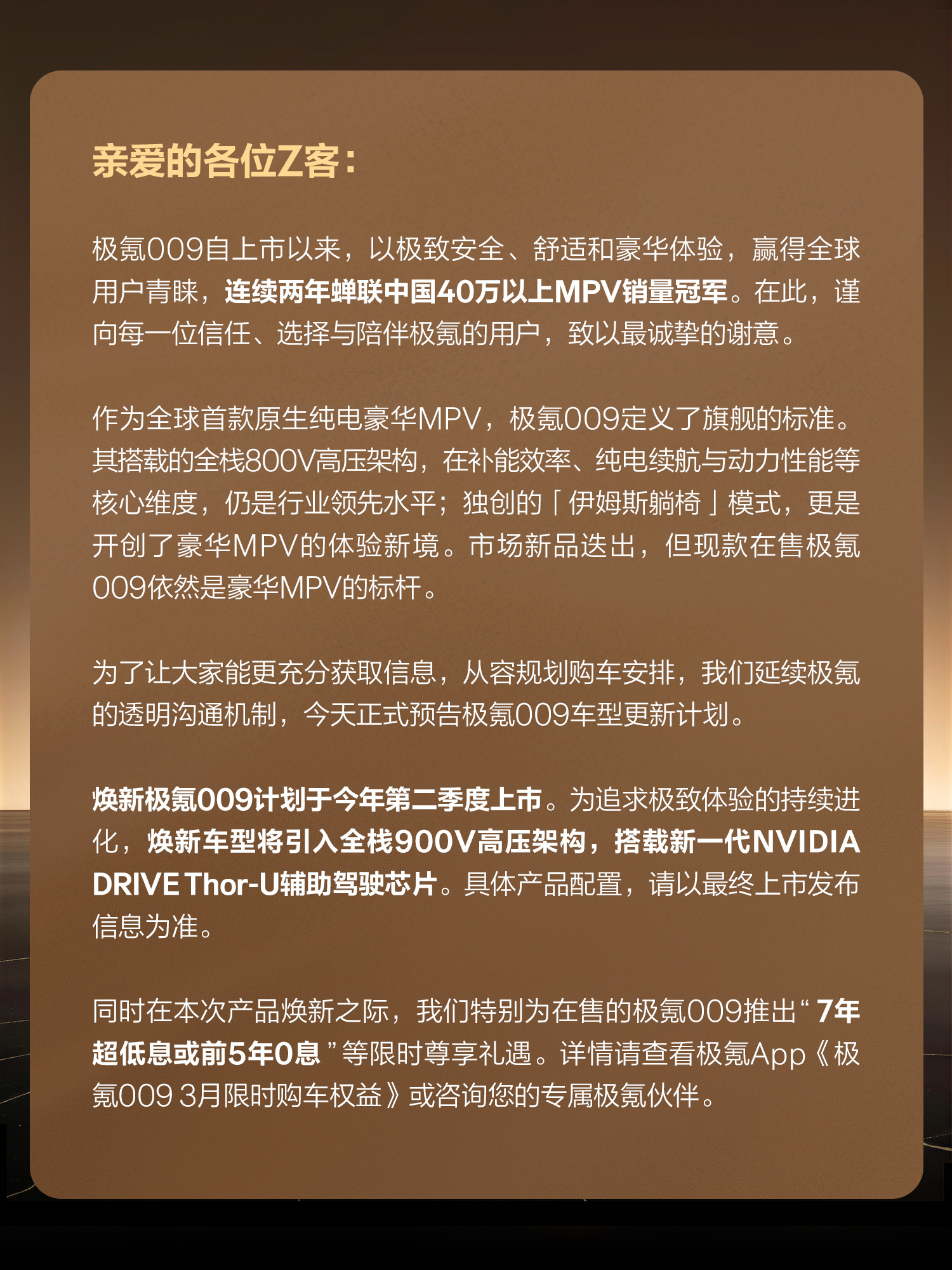 极氪009二季度焕新计划官宣,将搭载900V高压架构与Thor智驾芯片,实现三电智驾双跨代进化。现款三大标杆实力依旧能打,作为首款800V新能源MPV,性能快充拉满;2025年拿下香港MPV销冠,打破日系数十年统治,刘銮雄、郭富城、甄子丹等港圈名流都是车主,首创伊姆斯躺椅定义豪华。焕新之际购现款,享7年超低息或者五年免息,和明星富豪做车友。有二胎,三胎的家庭买极氪009非常合适。极氪009