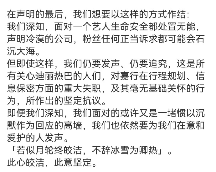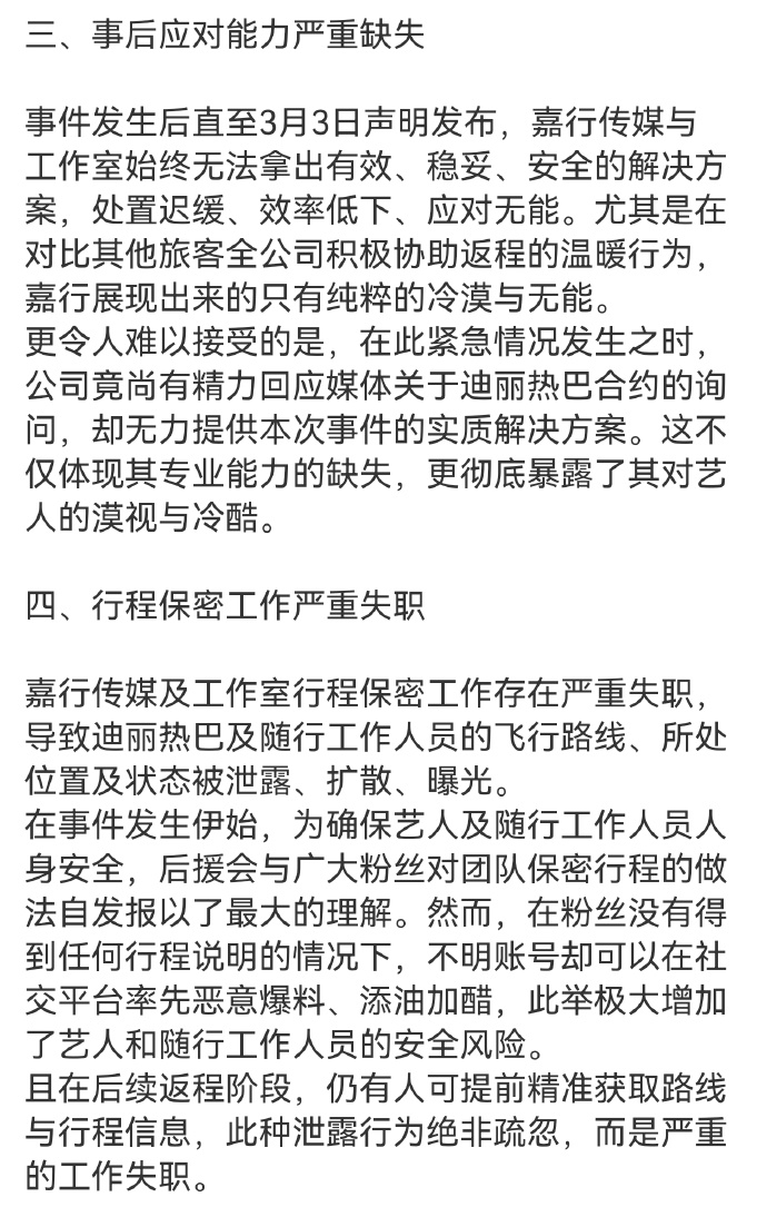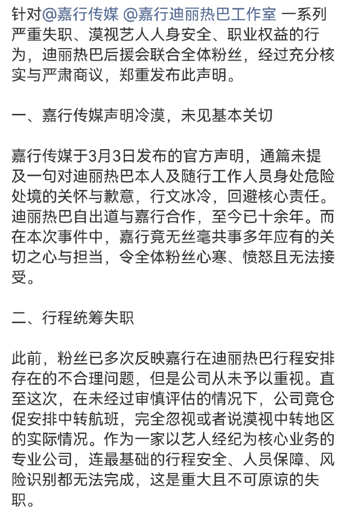 迪丽热巴后援会针对嘉行传媒发布声明