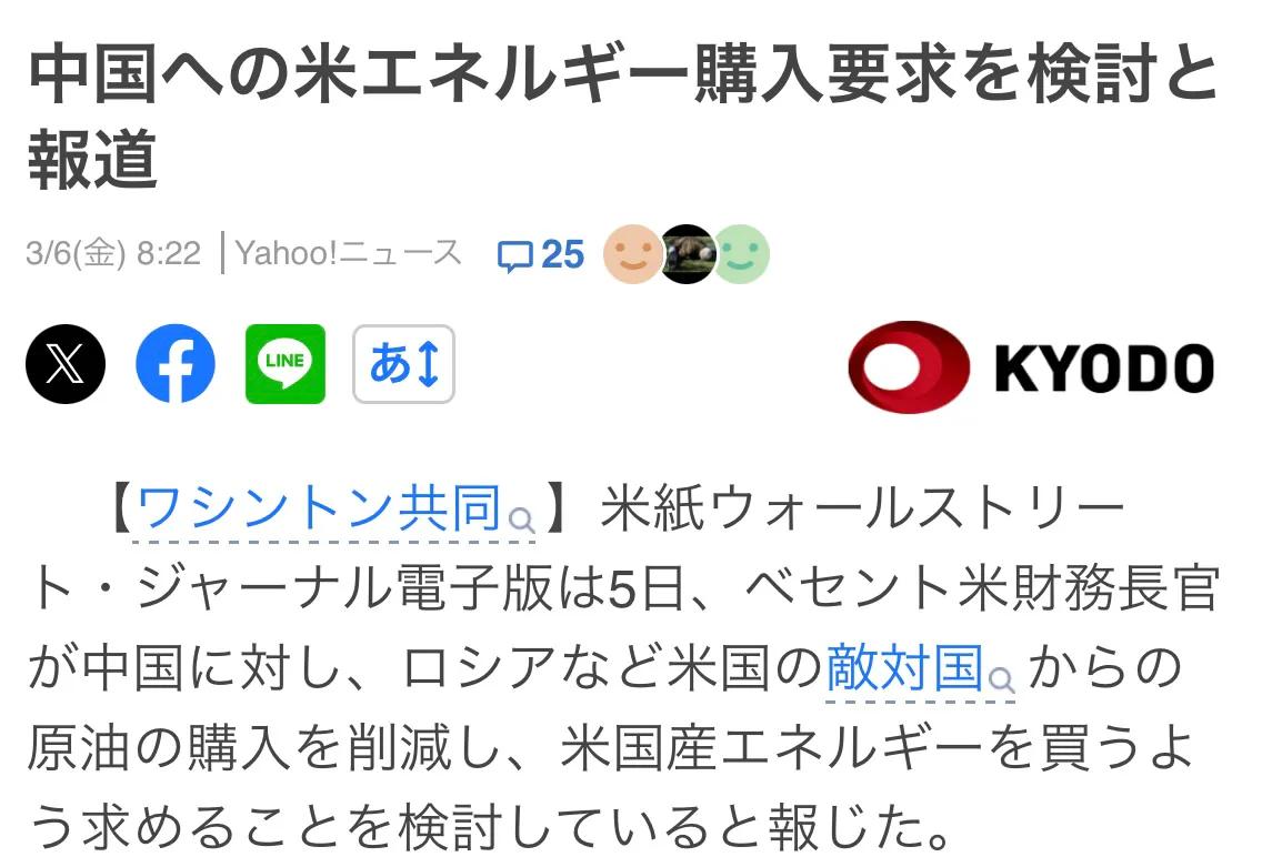 【日媒:美国计划要求中国购买美产原油】 日本共同通讯社发布短讯,援引《华尔街金融时报》消息称:美国财政部长贝森特表态说:美国正在考虑要求中国减少从俄罗斯等美国敌对国家购买原油。 有日本百姓惊呼:“日本的石油在哪里?伊朗的石油运不出来,美国又为了笼络把石油给了中国,谁来管管日本呢?” 有人安慰说:“美国这是看上中国的炼油厂了,把委内瑞拉的石油拉到中国去炼。日本买了委内瑞拉的油也没有用,不用急…..” 特朗普这算盘打得可真响啊