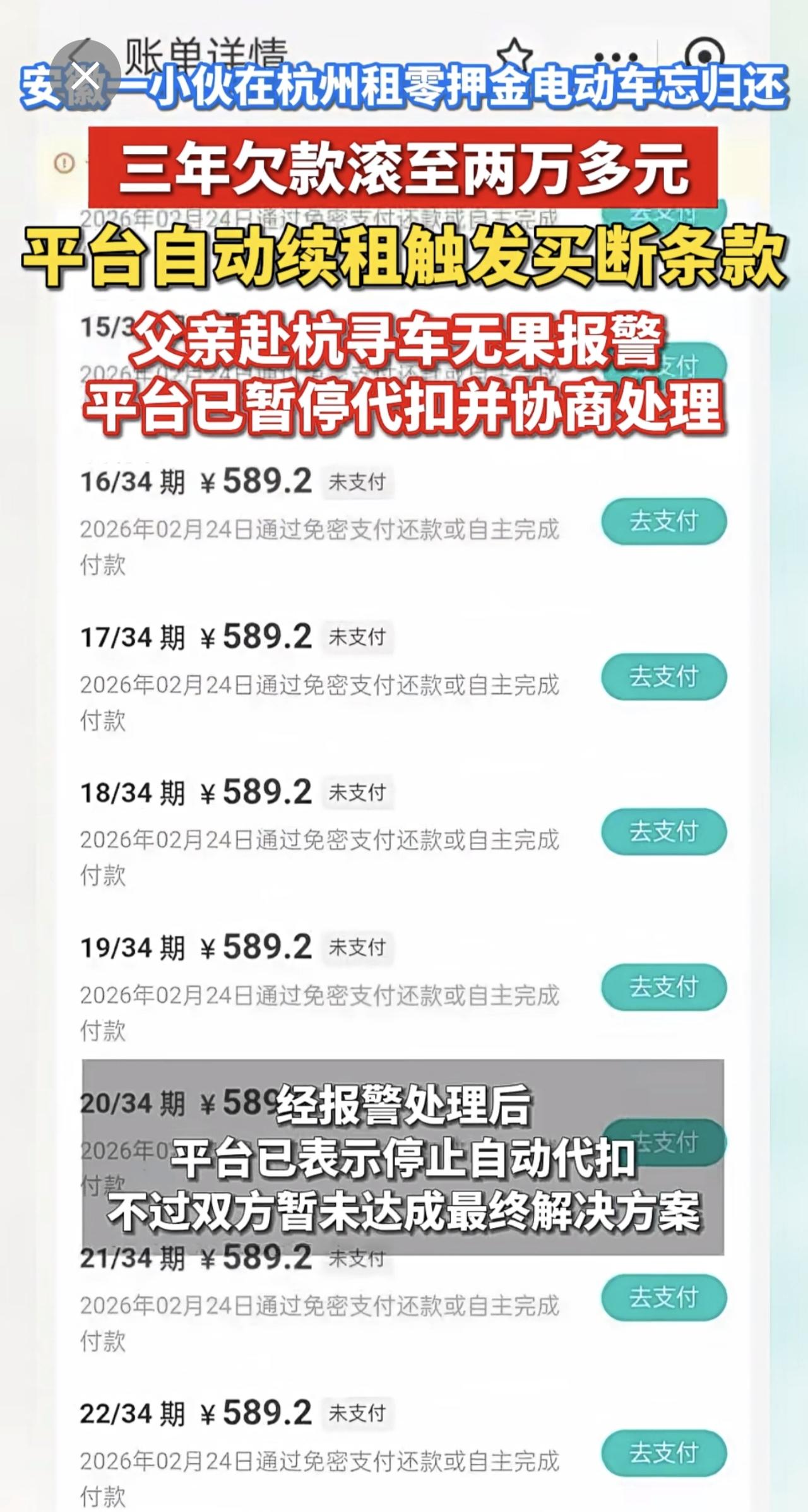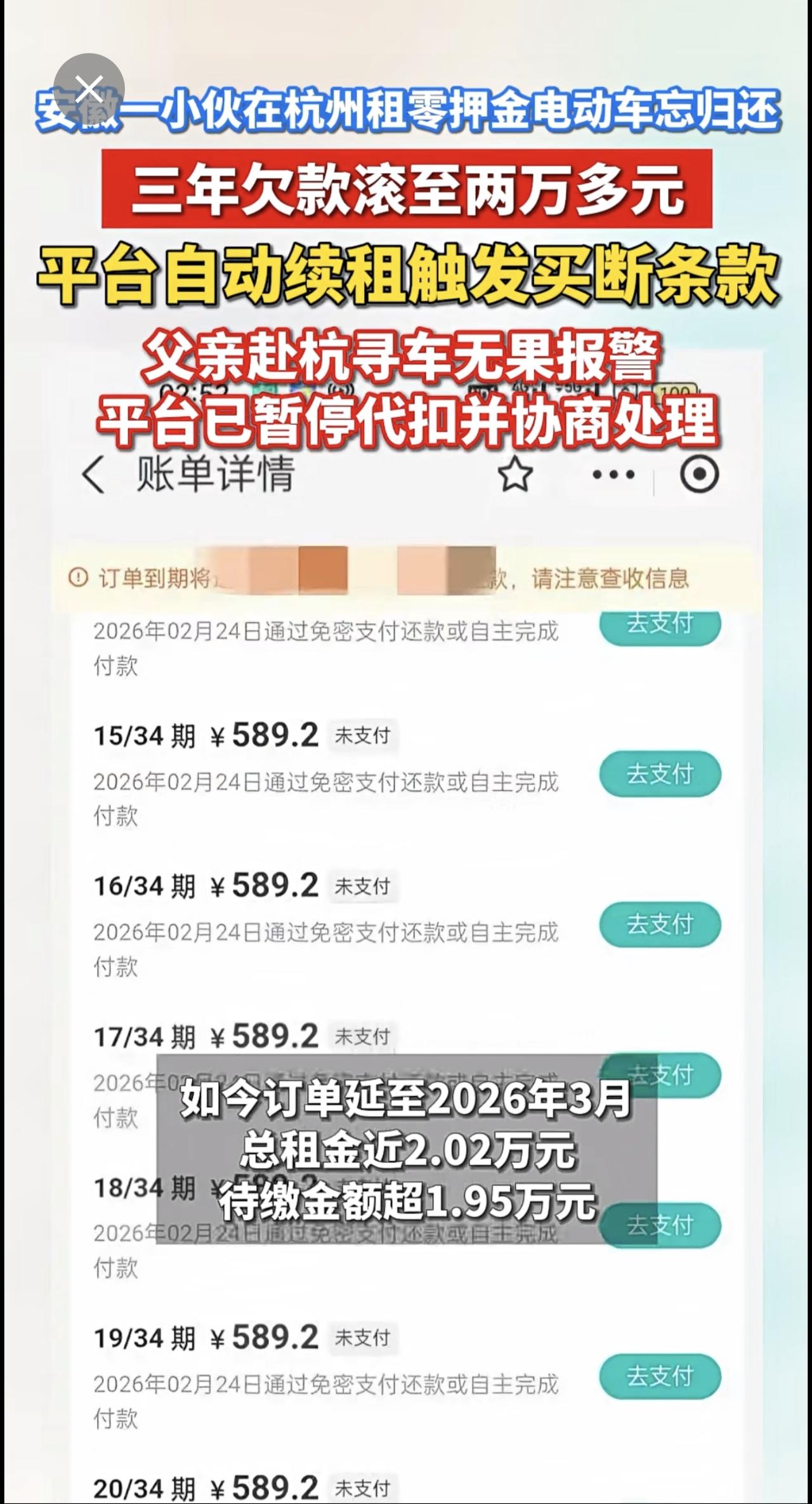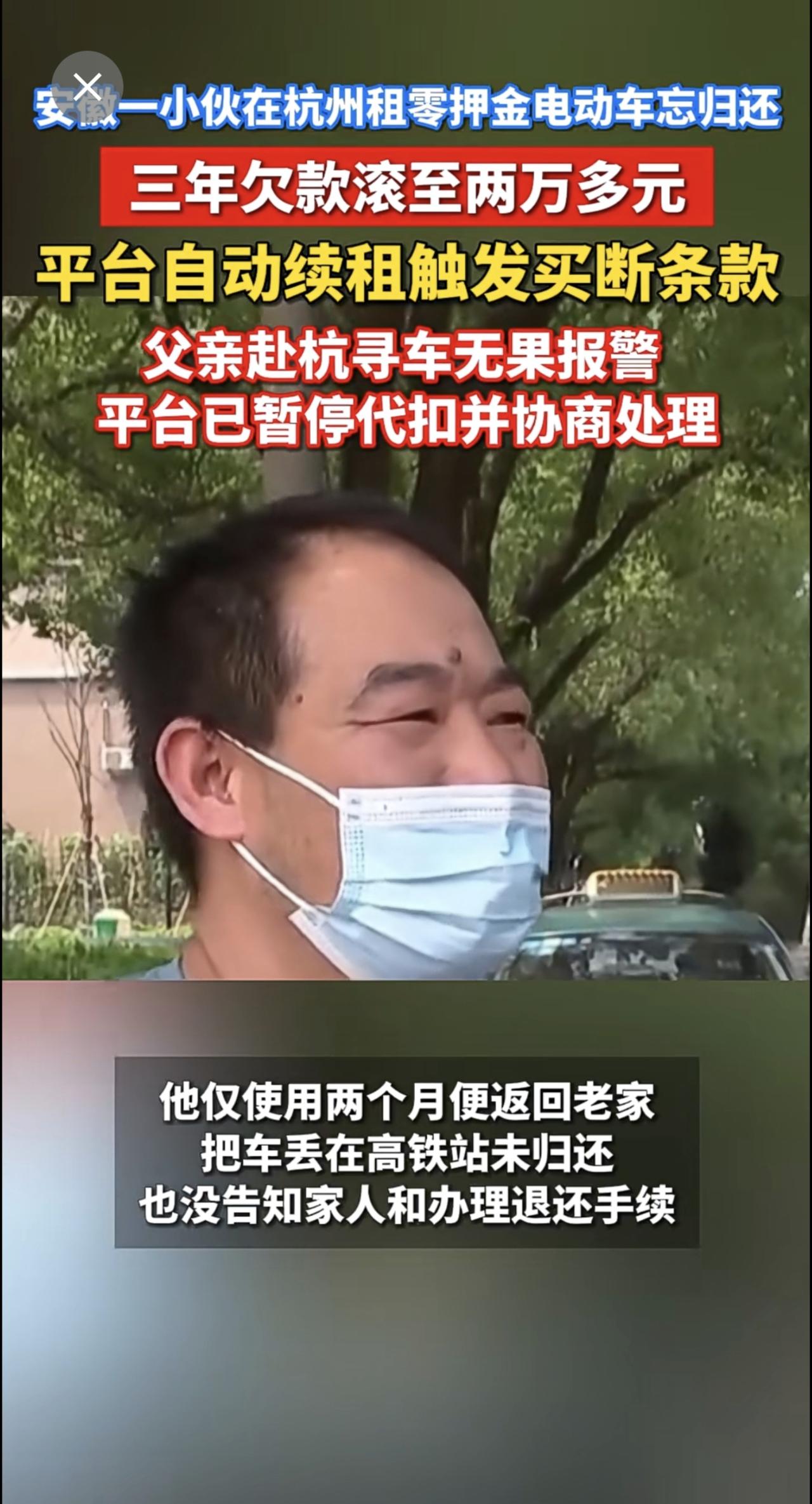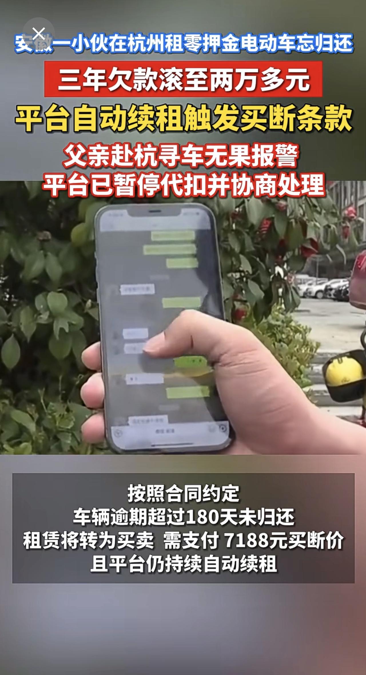 安徽一小伙在杭州租零押金电动车忘归还,三年欠款滚至两万多元。平台自动续租触发买断条款。父亲赴杭寻车无果报警,平台已暂停代扣并协商处理 零押金