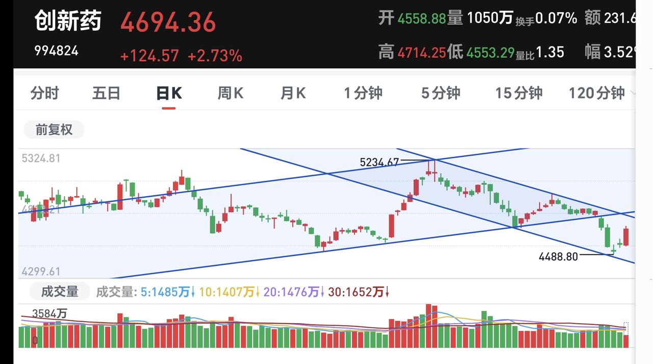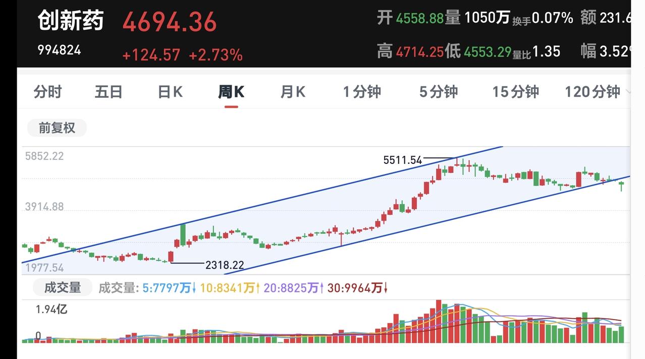 基金:创新药大涨,这个板块是不是已经反转 今天市场低开高走,三大指数都已经翻红,创业板指上涨了0.85%,收于3244点,上证指数上涨了0.25%,收于4118点。 今天黄色线在蓝色线上方,两条线之间的敞口非常大,这是今天上午能够低开高走并持续向上的主要原因,但今天上午两市累计成交13853亿,相比于昨天同期缩量了11%,这样的成交量不支持市场大幅度上涨。 中午收盘的时候,五天线位置4123点,收盘点位4118点,收在五天线之下,今天上午的反弹还是弱反弹范畴,下午需要观察,能不能站上并站稳五天线,还要观察有没有资金进场,也就是成交量的有效放大,没有资金进场的上涨都是耍流氓,没有资金进场的上涨都不能说明震荡调整已经结束。 整个市场上涨幅度最大的三个板块是:创新药板块,恒生科技板块,低空经济板块,下跌幅度最大的三个板块是:煤炭板块,有色金属板块,海外医药板块。 持有基金现在盘中估值上涨了9342元,盈利金额最大的三个板块是:创新药板块,证券板块,大消费板块,亏损的只有海外互联网板块和上证50板块。 创新药板块今天大涨,现在盘中估值上涨了3.54%,这是连续第二个交易日上涨,持有人数在所有板块当中排名第18位。 看下面的截图10,这是创新药板块日K线图,这个板块前段时间跌破了日线级别上涨通道下轨线以后,形成了一个新的日线级别短期下跌通道,今天的上涨并没有能够突破日线级别,短期下跌通道的上轨线,今天的上涨并没有能够改变日线级别,短期的下跌趋势,继续观察这个板块近期能不能上涨突破日线级别短期下跌通道的上轨线,在突破这条上轨线之前,都不要轻易判断这个板块已经反转。 看下面的截图11,这是创新药板块周K线图,连续3周在上涨通道下轨线上震荡以后,本周下跌跌破了周线级别上涨通道的下轨线,这个下跌也改变了创新药板块周线级别的上涨趋势,现在谈这个板块的反转还为时过早。 创新药板块我是每天定投200块钱,就这样慢慢定投下去,等待市场大盘真正止跌企稳的时候,再考虑这个板块要不要进场捞回止盈的筹码。 到中午收盘的时候,大盘的反弹都是弱反弹范围之内,这样的反弹随时随地会结束,即使今天下午因为黄色线高高在上而不会回落,下周初回落也是大概率事件,这一次的调整不会是三两天的调整,需要耐心等待调整的结束,等相对确定性的时候,我们再捞回止盈的筹码。 花1秒钟点赞,花30秒钟评论,就是对我最大的支持,谢谢大家的支持。