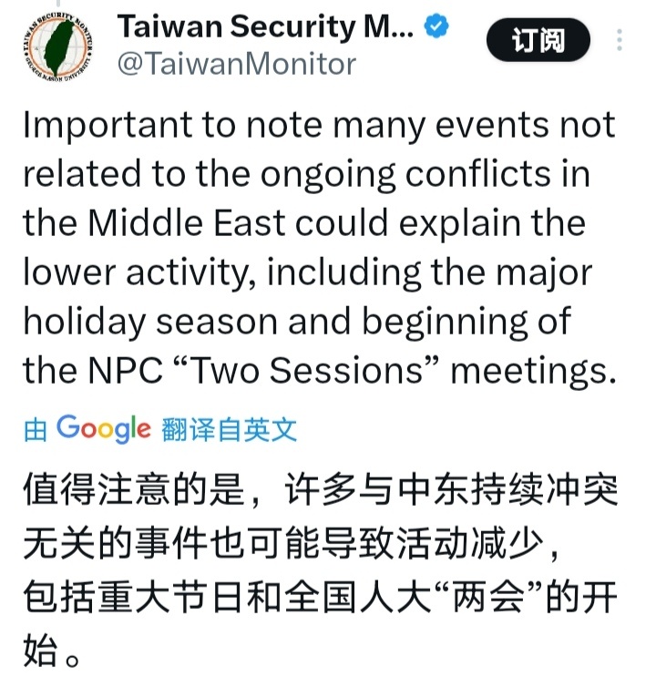 全国两会连续7天没侦测解放军军机了,说是近年来最长的一次暂停期。对岸分析可能和两会、中东局势有关。