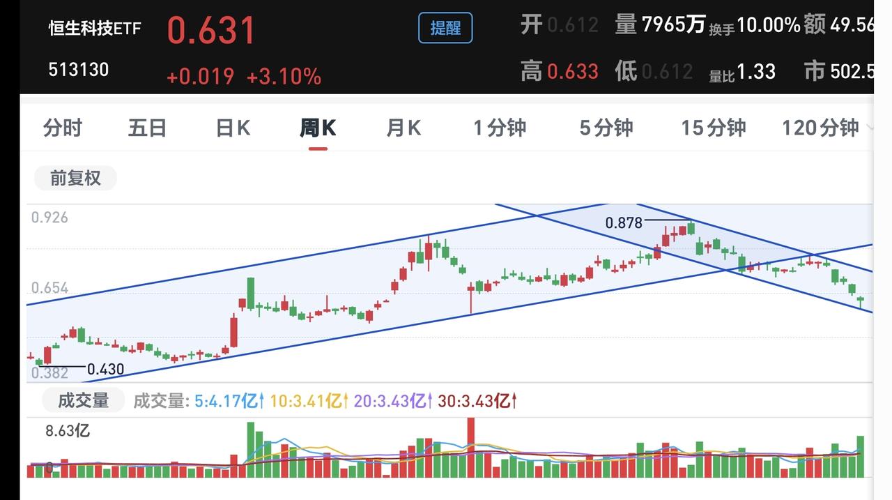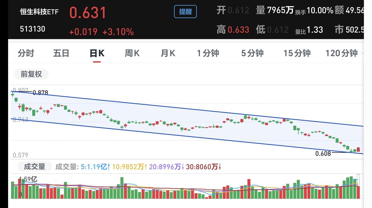 基金:恒生科技大涨,这个板块究竟是什么情况 香港市场今天也是大涨,恒生指数上涨了1.84%,国企指数上涨了2.18%,恒生科技指数上涨了3.66%,上涨幅度都比较大。 恒生科技板块今天在所有板块当中上涨幅度排名第2位,板块估值上涨了3.36%,持有人数在所有板块当中排名第11位,我们来看一下这个板块的情况。 看下面的截图3,这是恒生科技板块日K线图,现在的位置处于日线级别下跌通道内,距离下跌通道的下轨线比较近,现在的上涨是下跌到下跌通道下轨线的反弹,今天的上涨并没有改变恒生科技指数日线级别的下跌趋势,今天的上涨是在日线级别下跌通道内的震荡,恒生科技板块日线级别还是处于下跌趋势中。 看下面的截图4,这是恒生科技板块周K线图,前段时间下跌跌破了周线级别上涨通道下轨线以后,形成了一个新的短期下跌通道,本周的最低点打到了短期下跌通道的下轨线上,现在是反弹过程当中,这样的反弹并没有改变现有趋势,这样的反弹是一个无效的波动,定投的人可以继续定投。 许多人的仓位决定了自己的情绪,当自己仓位高的时候,见到下跌就难受,当自己仓位低的时候,见到上涨就难受,玩基金以后,大部分时间都处于难受之中,这样的状况必须要改变,需要改变的并不是市场的走势,需要改变的并不是市场的涨跌,因为,我们没有能力能够做出这样的改变,需要改变的是我们自己的心态,我们需要做到涨不喜跌不忧,做到这一点以后,才能是一个成熟的投资者。 当市场上涨的时候,要看这样的上涨有没有改变趋势,当市场下跌的时候,你要看这样的下跌有没有改变趋势,如果上涨和下跌都没有改变趋势,那就是无效的波动,这样的涨跌都不应该影响我们的情绪。 花1秒钟点赞,花30秒钟评论,就是对我最大的支持,谢谢大家的支持。