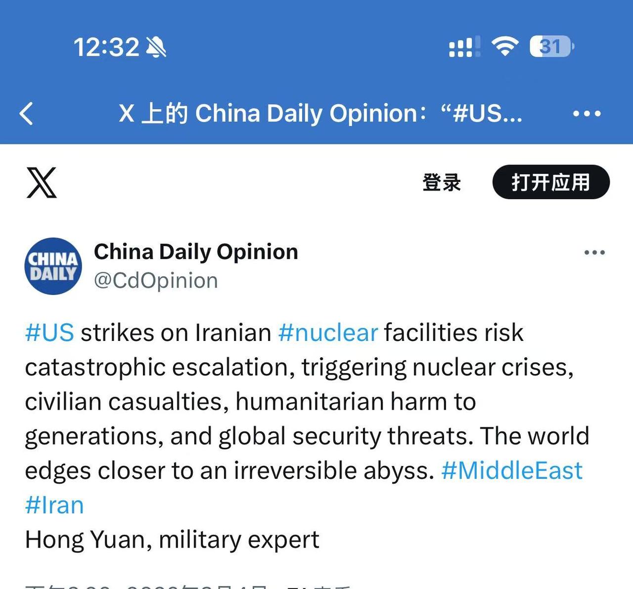 感谢中国日报发布到X的战事评论。 以美袭击伊朗 伊朗局势