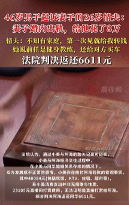 "太炸裂!"辽宁,一40岁已婚女子,在KTV看上26岁小伙,便谎称自己单身,还当场给小伙转账1216块,事后两人发生关系并背地里常常约会,女子为小伙花了8万多!女子46岁丈夫得知后大怒,要求小伙还钱却遭拒,双方闹到法庭,法院判决令人意外! 辽宁一个40岁的女人跟朋友一起去KTV唱歌,几个人正玩得嗨呢,隔壁包厢的26岁小伙推门进来敬酒。小伙子年轻帅气,唱歌还好听,女人一眼就动心了,压根没想着自己已经结婚,当场就主动凑上去搭话。 对着这个年轻小伙,女人倒是一点不藏着掖着自己的大方,可偏偏瞒了自己已婚的事儿,张口就说自己是单身,说着就拿出手机,给小伙转了1216块钱,笑着说“今天我请客,你随便玩”。 小伙刚踏入社会没多久,看着眼前这么大方又热情的女人,一时没扛住诱惑,就留下来陪着女人一起喝酒、唱歌。 酒喝多了,俩人的关系也跟着热起来,当天晚上就发生了关系。从那以后,女人就对小伙上了心,天天主动联系他,约他出来约会,俩人就这么背地里偷偷来往,跟热恋的小情侣似的。 为了能留住小伙,女人更是大方得没边儿,只要小伙想要的,她都尽量满足。不管是520、1314那种表达心意的红包,还是小伙嘴里说的“创业启动钱”, 就连俩人约会时的KTV消费、开房钱,甚至小伙想要的名牌小饰品,女人都一一买单,半点儿不心疼。 也就一个多月的功夫,女人前前后后给小伙花了8万多块钱。可俩人处得越久,小伙心里就越犯嘀咕——女人每次接电话都躲躲闪闪,从来不在他面前提家里的事儿,也不带他去自己住的地方,更不让他认识自己的朋友。 小伙心里的疑心越来越重,就偷偷跟着女人,这一跟踪,才发现了一个让他当场炸毛的真相: 女人根本不是单身,她已经结婚十年了,她丈夫今年46岁,俩人还有个正在上中学的孩子。知道真相的小伙气得不行,当场就跟女人提了分手。 可女人这时候已经对小伙动了真情,哪儿能轻易放手。她哭着跟小伙道歉,说自己跟丈夫早就没感情了,常年分居, 还承诺只要小伙愿意继续跟她来往,每个月都会给小伙一笔钱当补偿。小伙一时被钱迷了心窍,就打消了分手的念头,接着跟女人偷偷来往。 世上没有不透风的墙,女人天天往外跑,还大把大把花钱,很快就被她46岁的丈夫发现了不对劲。 丈夫偷偷留意女人的行踪,翻了她的手机转账记录和聊天记录,这才知道,自己的妻子不仅出轨了一个比自己小20岁的小伙,还在一个多月里,给对方花了8万多块钱。 丈夫气得浑身发抖,他跟女人结婚十年,起早贪黑打拼,攒下的钱都是俩人的共同财产,妻子竟然背着他,把这么多钱花在一个外人身上。 他立马联系上那个小伙,要求小伙把8万多块钱全额还回来,可小伙却死活不还,还嘴硬说这些钱是女人自愿给他的,甚至说自己也给女人转了7000多块钱。 俩人吵得不可开交,谁也不让谁。丈夫见小伙态度这么强硬,没办法,只能把小伙告上了法院,要求法院判小伙返还妻子擅自花掉的夫妻共同财产8万多块钱。 丈夫当时还琢磨着,自己有理有据,肯定能把钱全部要回来,可法院的审理结果,却给了他当头一棒。 法院查来查去,最后给出了判决:女人直接给小伙转的14338块钱,属于夫妻共同财产,小伙必须还; 而那4.8万块钱的餐饮、住宿之类的开销,是俩人一起花的,不用还;至于那些520、1314的红包,属于自愿的情感赠与,是合法的,也不用还。 这么一算,小伙最后只需要还给丈夫6611块钱就行。这个结果,丈夫怎么也接受不了,可也没别的办法,只能硬着头皮认了。 而那个女人,面对丈夫的怒火和这场荒唐的纠纷,也只能默默扛着,丈夫念着俩人十几年的夫妻情分,没提离婚,只丢下一句“下次再这样,绝不饶你”,就没再追究。 女人和她丈夫的婚姻还在继续,只是俩人之间,早就没了以前的温情,只剩下说不完的隔阂。这场闹剧,也算是给所有已婚的人提了个醒,婚姻里的忠诚,真的不能当儿戏。 对此,你们有什么看法,欢迎评论留言~