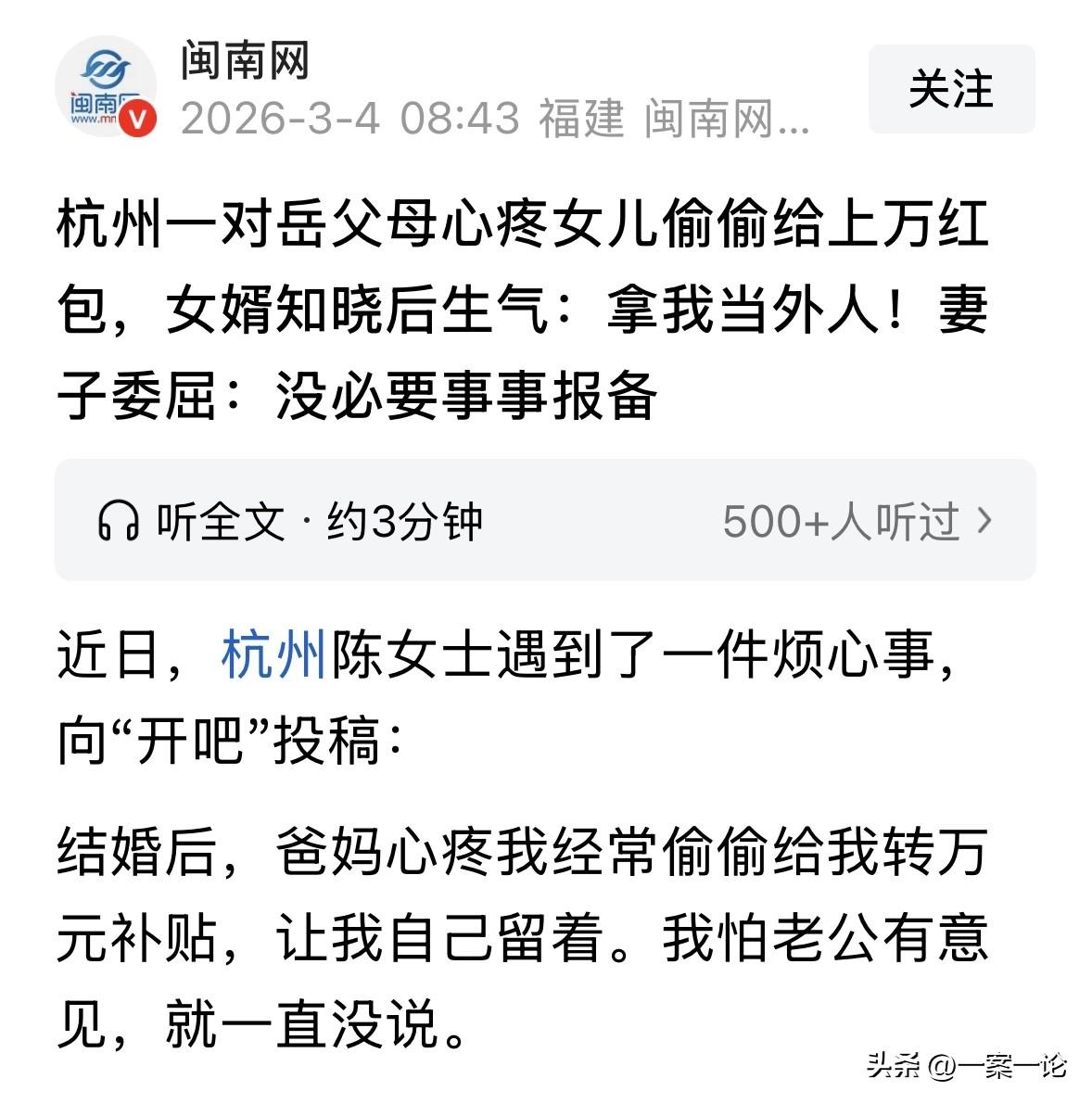 浙江杭州,女子出嫁后,父母心疼她,就经常偷偷给她转上万的红包,让女子自己留着花,丈夫发现后特别生气,觉得岳父岳母拿他当外人,大额转账应该透明,背地里给就是提防他,不信任他,丈夫觉得夫妻间不应该有这种秘密。可女子却很委屈,认为没有事事都要报备的必要。 陈女士最近觉得家里的空气都凝固了,这一切都源于手机里那几条没来得及删的银行短信。 事情得从她结婚后说起。 陈女士娘家条件不错,爸妈看着女儿在婆家过日子,总觉得哪怕嫁出去了也是自家的心头肉。 说老两口怕女儿手头紧,时不时就偷偷转个万把块钱过来,还千叮咛万嘱咐:别让女婿知道,男人嘛,都要面子,省得他心里不舒服。 陈女士拿着这些体己钱,心里是暖的,但也有点虚。 她把这事儿捂得严严实实,连买菜找零都尽量不用这张卡,就怕老公哪天查账露出马脚。 纸终究包不住火。那天晚上,老公拿着陈女士的手机想点个外卖,屏幕一亮,几条大额转账提醒映入眼帘。 看着备注里“妈妈给的零花钱”,老公的脸瞬间拉了下来,手机往桌上一拍,声音都变了调,说:咱俩是一家人,你爸妈给你钱还得‘偷偷’给?这是防贼呢,还是觉得我养不起你? 陈女士当时就懵了,支支吾吾解释,说我爸妈就是心疼我,怕你多想…… 怕我多想?不告诉我才是真的多想!老公根本听不进去,他觉得自己像个外人,被这一家子蒙在鼓里。 在他看来,夫妻之间大额钱财必须透明,这种偷偷摸摸的行为就是对他的不信任,甚至是对他作为男人能力的羞辱。 陈女士也觉得委屈。她坐在沙发上抹眼泪,心里想:我爸妈给我钱是天经地义,又没让你还,怎么就成不坦诚了?难道结了婚,连娘家的疼爱都得充公? 有人看了陈女士的遭遇,点评她老公就是典型的无能狂怒,多赚钱吧! 这话虽然扎心,但也代表了一部分人的看法,觉得男方与其在这儿跟老婆较劲,不如自己努力多挣点,让岳父岳母放心把女儿交给他。 也有人说,如果是我,我会主动讲,但作为老公,不能因为我没讲就责怪我,这得有个默契。 言下之意,女方不说是怕伤和气,男方逼问就是不懂事了。 还有人一眼看出了问题的本质,说明显女方家庭比男方好,岳父岳母是不想伤女婿自尊才偷偷给。老公生气说到底还是自尊心作祟,有本事就多努力赚钱,这才是一个男人该做的。 看着网上的评论,陈女士心里更乱了。她觉得自己没做错,爸妈也没做错,可老公的怒火也是真的。 这日子还得过,但这道因为钱划出的裂痕,怕是没那么容易补上了。 根据《民法典》第1062条第一款:夫妻在婚姻关系存续期间所得的下列财产,为夫妻的共同财产,归夫妻共同所有:继承或者受赠的财产,但是本法第一千零六十三条第三项规定的除外。 这条法律直接戳破了陈女士“偷偷存私房钱”的法律盲区。 在法律眼里,婚后父母给的私房钱,除非老两口在转账时白纸黑字写明“只给女儿一人,不给女婿”,否则默认就是夫妻共同财产。 陈女士觉得“爸妈给我就是我的”,那是亲情逻辑。但在法律逻辑里,只要没明确排除女婿,这钱就有老公的一半。 所以,老公生气不仅是情绪问题,更是权利被侵犯的法律问题。夫妻对共同财产有平等的处理权,陈女士隐瞒大额收入,客观上剥夺了老公的知情权和支配权。 当然,网友说的自尊也是现实考量,岳父岳母偷偷给是怕伤女婿面子,但这种善意反而因法律上的权属不清变成了恶意隐瞒。 对于这件事,你怎么看? 欢迎关注@一案一论