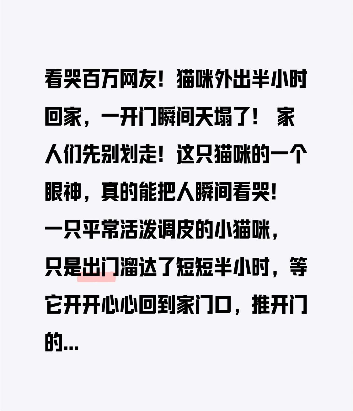 看哭百万网友!猫咪外出半小时回家,一开门瞬间天塌了! 家人们先别划走!这只猫咪的一个眼神,真的能把人瞬间看哭!一只平常活泼调皮的小猫咪,只是出门溜达了短短半小时,等它开开心心回到家门口,推开门的那一刻,整只猫直接僵在原地,眼神里的光瞬间熄灭,仿佛整个世界都塌了! 视频里,猫咪原本迈着轻快的小步子回家,尾巴翘得高高的,满脑子都是回家撒娇、吃饭、贴贴。可当它走进屋里,环顾一圈后,脚步突然停住,耳朵耷拉下来,身体微微发抖,原本明亮的眼睛一下子黯淡无光。它小心翼翼地走到空荡的房间里,闻一闻沙发,看一看角落,一遍又一遍寻找,可怎么也找不到那个最熟悉的身影。 真正的转折点,让所有人破防! 原来,猫咪最依赖、最疼爱它的主人,刚刚因为意外永远离开了。家人来不及收拾东西,也不知道该怎么告诉这只傻傻等待的小猫。它还以为主人只是出门了,还会像往常一样喊它的名字,给它喂零食,抱它在怀里睡觉。 可这一次,家里安安静静,没有声音,没有温度,只剩下它孤单的小身影。 猫咪蹲在主人常坐的位置,一动不动,眼神空洞,连叫都叫不出来,好像一夜之间长大了,又好像彻底失去了依靠。 网友们看完纷纷泪目: “它什么都懂,只是不会说话。” “它的世界很小,小到只有你一个人。” “你离开的一瞬间,它的天,真的塌了。” 我们总觉得猫咪高冷、记仇、没心没肺,可真正失去主人的时候,它们的难过一点都不比人少。你陪它十几年,它却用一生来陪你;你有家人朋友工作,而它,只有你。 这只猫咪的崩溃,不是演的,是刻在骨子里的依赖与爱。 它不懂什么是离别,只知道:那个最爱我的人,再也不会回来了。 愿所有毛孩子都能被温柔守护,愿所有主人都能陪它们走完一生。 别让爱你的小动物,独自面对空荡荡的家。 因为对你来说,它只是一只宠物; 对它来说,你就是全世界。 如果你也被这只猫咪打动,点赞转发,愿每一份陪伴都不被辜负!