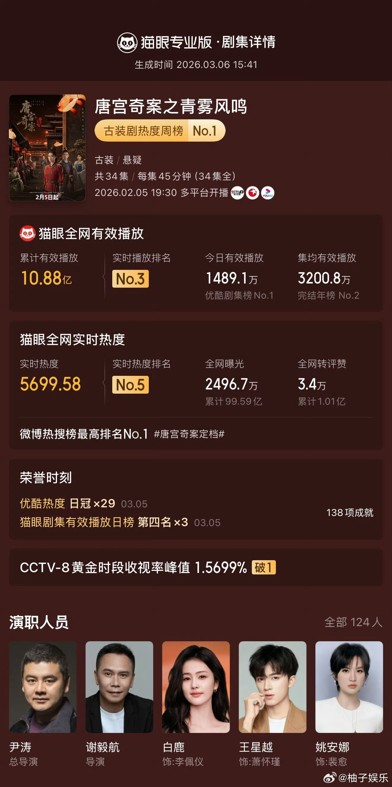 白鹿唐宫奇案豆瓣开分7.0分,全网有效播放量已超10.88亿了,白鹿演绎的李佩仪满分,值得更高!