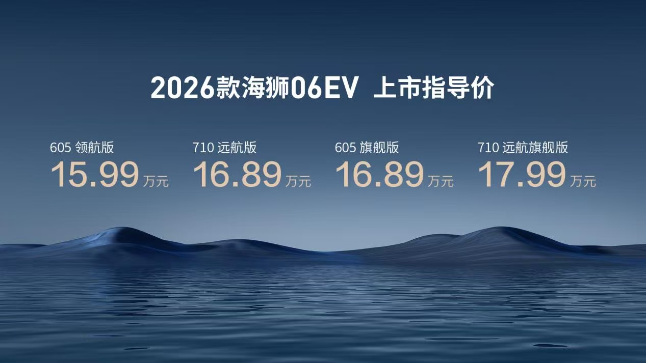 日前,2026款海狮06EV迎来上市,4款车型,售价为15.99-17.99万元。 先看产品。首先必须聊下技术,闪充技术+第二代刀片电池加持,该车从10%充至97%也仅需9分钟,搭配最高710km的纯电续航,彻底消除里程焦虑。 同时,新车支持选装激光雷达,搭载天神之眼5.0,可实现城市领航辅助、高快智驾辅助、全场景泊车等功能,让驾驶更轻松。 其次是配置升级。除了142L前备箱之外,座椅记忆、前排座椅按摩、副驾腿托/腰撑、香氛系统等也统统安排到位。再者是驾控体验。新车搭载了云辇-C并新增路面预瞄功能,提高整车的舒适性。另外,TBC高速爆胎稳行系统加入,最大程度保障行车安全。 此外,设计这块,该车新增了琉光银外观、暮色蓝内饰等个性化选择。 小结一下:2026款海狮06EV最大的看点还是技术,这是对新能源化上半场交出的一张完整答卷,也是该车最大的差异化优势之一。至于智能、舒享、设计、驾控等维度的升级,也算是对用户需求的积极响应。接下来,期待其市场表现。