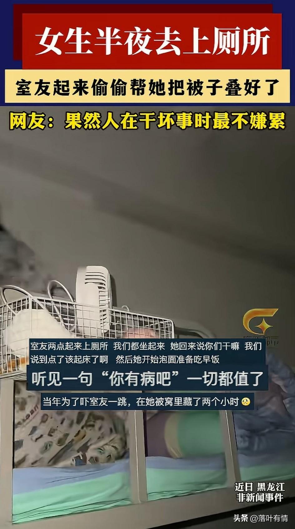 不光男生宿舍,喜欢玩, 女生宿舍也有喜欢玩的女生, 一女生趁着室友起来上厕所, 赶紧起来给室友的被子叠好了, 然后迅速躺下装睡觉, 她的室友回来之后, 整个人都呆住了, 还以为自己出现了错觉, 都半夜2点还能干这事, 果然人在做坏事的时候永远不觉得累, 看到这些网友纷纷想到了自己的大学经历,有网友为了吓自己的室友, 居然在室友的被窝里待了俩小时, 就为了听那一句,你有病吧! 大家有过这样的快乐的大学经历吗?
