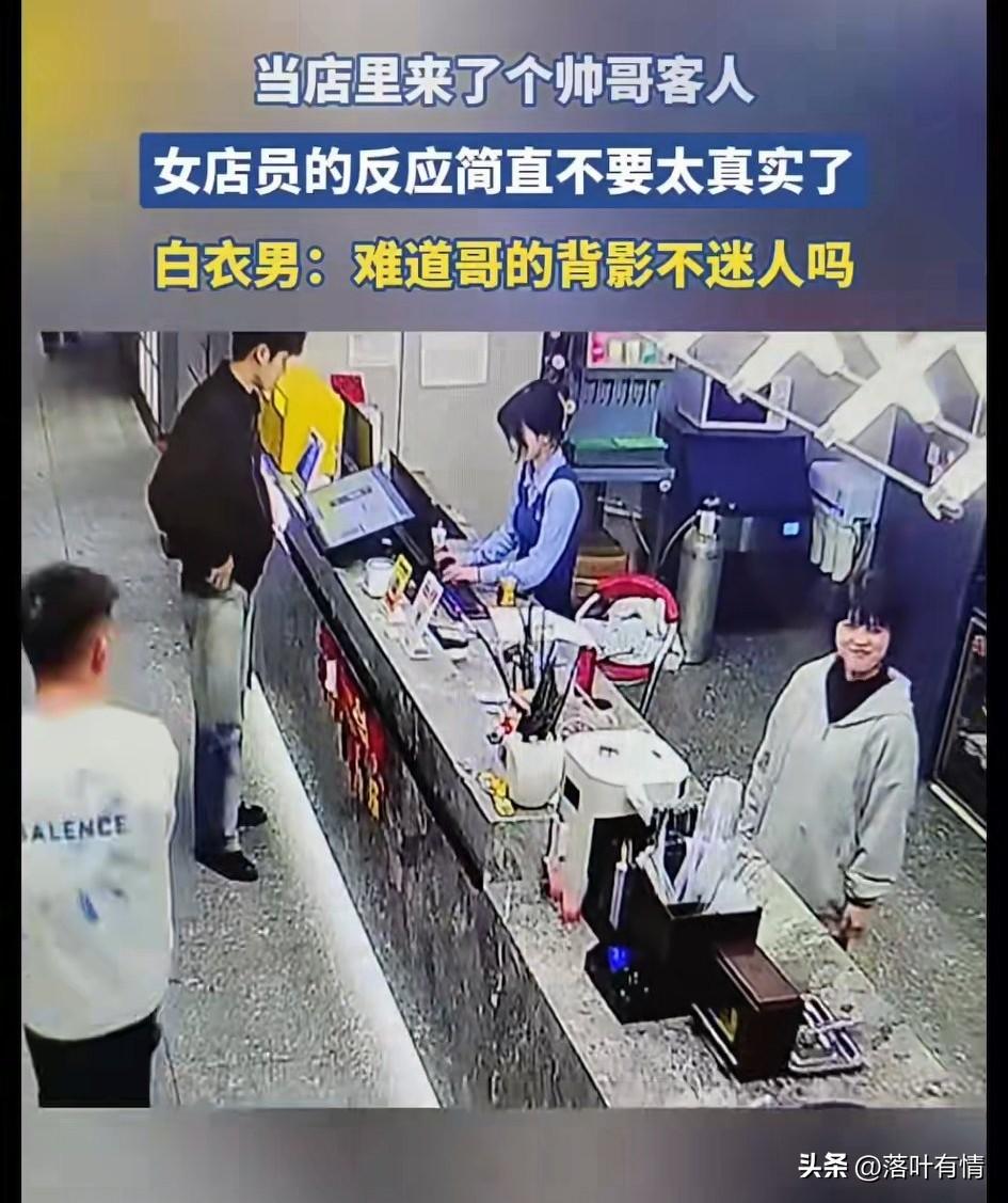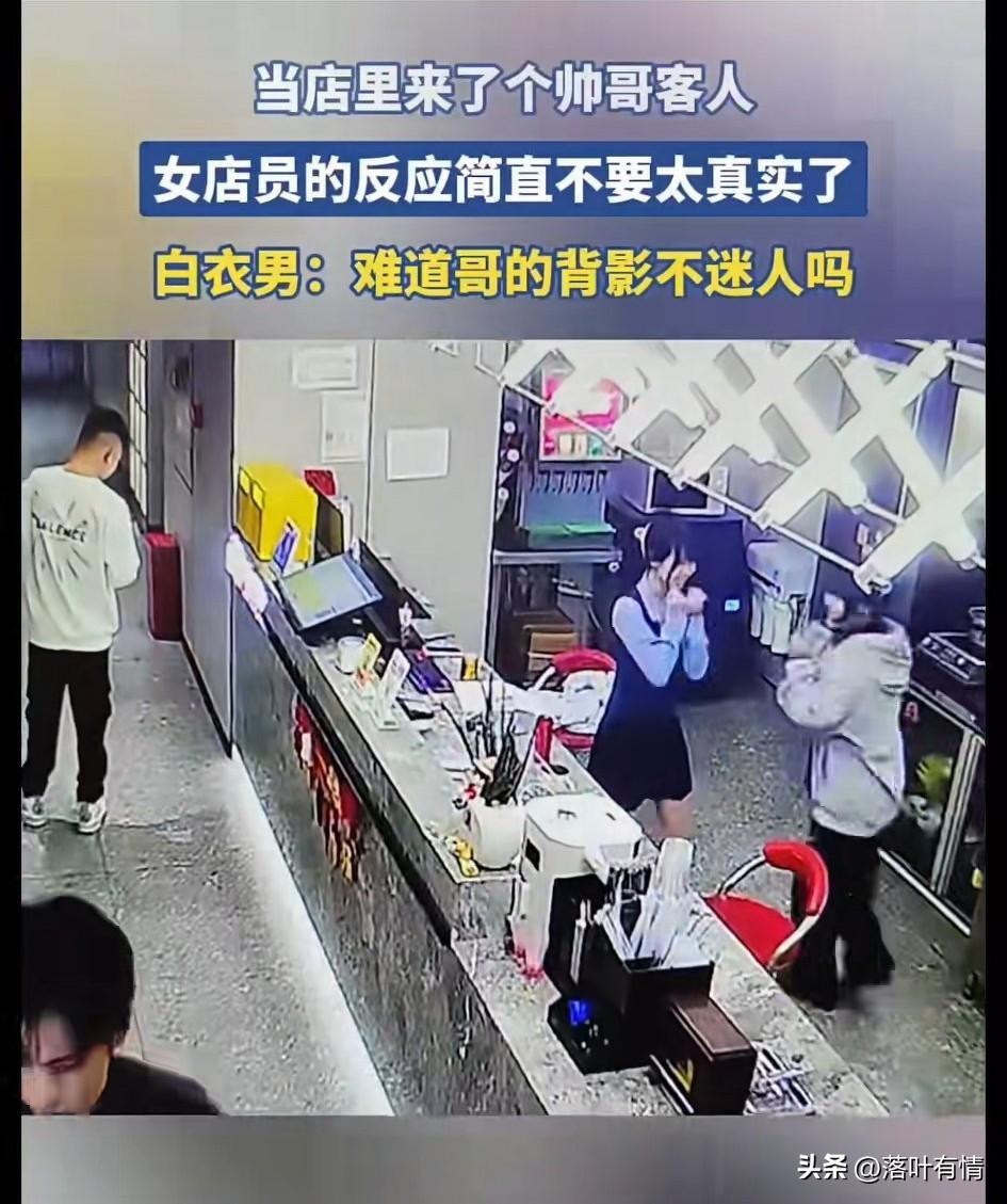 当店里来了一个帅哥的时候, 这个要奶茶店小妹妹开心坏了, 本来还趴在那里睡觉, 瞬间来了精神, 赶紧给这位帅哥服务, 还给帅哥指了指厕所的位置, 不一会另一个妹妹也过来了, 满脸的开心, 两个人盯着这位帅哥看, 期间还过来了几个男生, 不过他们都是很敷衍的服务, 都不忘看这个帅哥远去的背影, 帅哥走后, 两个妹子激动的手舞足蹈, 这个一个穿白衣服的小哥惊呆了, 小哥肯定在想我不帅吗? 不要说中国的女生不主动, 见到帅哥的她们不亚于我们看美女, 如果她对你不这样, 肯定是你不够帅!